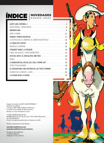 LUCKY LUKE. INTEGRAL 1............................................................. 3XIII 29. MOSC%u00da - SPASO HOUSE ....................................................... 8GREMORYLAND......................................................................... 9HOTEL FLORIDA ....................................................................... 11WEIMAR. TIEMPOS INCIERTOS ....................................................... 17LA ESTATUA DE LA LIBERTAD. EL SUE%u00d1O DE BARTHOLDI .......................... 23LA VENUS DEL ESPEJO............................................................... 29REGRESO A LIVERPOOL ............................................................... 35STRANGER THINGS. LA TRAVES%u00cdA .................................................... 40FERAL (SALVAJES) 1. GATOS DOM%u00c9STICOS ........................................ 41ESTE DEL OESTE. EL APOCALIPSIS: A%u00d1O TRES....................................... 46 SERIAL ................................................................................ 47LA BENDICI%u00d3N DEL OFICIAL DEL CIELO. FRAME-ART .............................. 52OTROS T%u00cdTULOS MANGA .............................................................. 53EL DALMARCIANO. UNA HISTORIA DE LUCY RUTH CUMMINS....................... 58CUANDO CAE LA NOCHE 1. LISOU .................................................... 61LA CIUDAD BAJO LA CIUDAD......................................................... 67NOVEDADESENERO 2025Imagen de cubierta: LUCKY LUKE INTEGRAL 1 de Goscinny y Morris.%u00a9 Dupuis 1956-1960, by Morris & Goscinny%u00a9 Lucky Comics 2025. All rights reservedEdici%u00f3n no venal. Prohibida su venta.%u00a9 2025 NORMA Editorial S.A. NORMA Editorial, S.A. Pg. St. Joan 7, Pral. 08010 Barcelona.Tel.: 93 303 68 20. E-mail: norma@normaeditorial.com. Impreso en la UE.Dise%u00f1o y maquetaci%u00f3n: Joan Morenowww.NormaEditorial.comwww.NormaEditorial.com/noticiasFacebook: NormaEditorialX: @NormaEditorialInstagram: norma_editorial