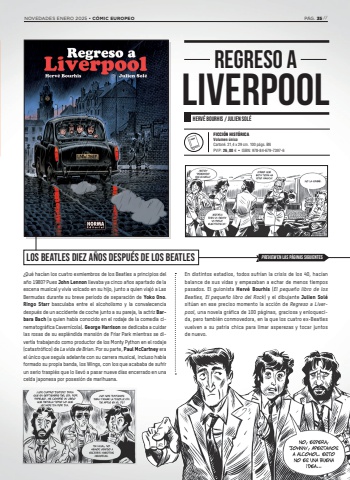 LOS BEATLES DIEZ A%u00d1OS DESPU%u00c9S DE LOS BEATLES%u00bfQu%u00e9 hac%u00edan los cuatro exmiembros de los Beatles a principios del a%u00f1o 1980? Pues John Lennon llevaba ya cinco a%u00f1os apartado de la escena musical y viv%u00eda volcado en su hijo, junto a quien viaj%u00f3 a Las Bermudas durante su breve per%u00edodo de separaci%u00f3n de Yoko Ono. Ringo Starr basculaba entre el alcoholismo y la convalecencia despu%u00e9s de un accidente de coche junto a su pareja, la actriz Barbara Bach (a quien hab%u00eda conocido en el rodaje de la comedia cinematogr%u00e1fica Cavern%u00edcola). George Harrison se dedicaba a cuidar las rosas de su espl%u00e9ndida mansi%u00f3n de Friar Park mientras se divert%u00eda trabajando como productor de los Monty Python en el rodaje (catastr%u00f3fico) de La vida de Brian. Por su parte, Paul McCartney era el %u00fanico que segu%u00eda adelante con su carrera musical, incluso hab%u00eda formado su propia banda, los Wings, con los que acababa de sufrir un serio traspi%u00e9s que lo llev%u00f3 a pasar nueve d%u00edas encerrado en una celda japonesa por posesi%u00f3n de marihuana. En distintos estadios, todos sufr%u00edan la crisis de los 40, hac%u00edan balance de sus vidas y empezaban a echar de menos tiempos pasados. El guionista Herv%u00e9 Bourhis (El peque%u00f1o libro de los Beatles, El peque%u00f1o libro del Rock) y el dibujante Julien Sol%u00e9sit%u00faan en ese preciso momento la acci%u00f3n de Regreso a Liverpool, una novela gr%u00e1fica de 100 p%u00e1ginas, graciosa y enloquecida, pero tambi%u00e9n conmovedora, en la que los cuatro ex-Beatles vuelven a su patria chica para limar asperezas y tocar juntos de nuevo.HERV%u00c9 BOURHIS / JULIEN SOL%u00c9LIVERPOOLREGRESO AFICCI%u00d3N HIST%u00d3RICAVolumen %u00fanicoCarton%u00e9. 21,4 x 29 cm. 100 p%u00e1gs. BNPVP: 26,00 %u20ac %u2022 ISBN: 978-84-679-7397-6PREVIEW EN LAS P%u00c1GINAS SIGUIENTESNOVEDADES ENERO 2025 %u2022 C%u00d3MIC EUROPEO P%u00c1G. 35 //