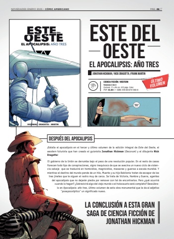 JONATHAN HICKMAN / NICK DRAGOTTA /FRANK MARTINESTE DELOESTEEL APOCALIPSIS: A%u00d1O TRESCIENCIA FICCI%u00d3N / WESTERNVolumen 3 de 3Carton%u00e9. 17 x 26 cm. 512 p%u00e1gs. Color PVP: 45,00 %u20ac %u2022 ISBN: 978-84-679-7393-8DESPU%u00c9S DEL APOCALIPSIS%u00a1Estalla el apocalipsis en el tercer y %u00faltimo volumen de la edici%u00f3n integral de Este del Oeste, el western futurista que han creado el guionista Jonathan Hickman (Decorum) y el dibujante Nick Dragotta! El gobierno de la Uni%u00f3n se derrumba bajo el peso de una revoluci%u00f3n popular. En el resto de casas florecen todo tipo de conspiraciones, signo inequ%u00edvoco de que se avecina un nuevo ciclo de violencia salvaje que se traducir%u00e1 en homicidios, magnicidios, masacres y guerras a escala mundial. Y mientras el destino del mundo pende de un hilo, Muerte y su hijo Babilonia tratan de escapar de los tres jinetes que le siguen el rastro muy de cerca. Se trata de Victoria, Hambre y Guerra, agentes del apocalipsis que no dejar%u00e1n piedra por remover con tal de encontrarlos. Pero %u00bfqu%u00e9 ocurrir%u00e1 cuando lo hagan? %u00bfSobrevivir%u00e1 algo del viejo mundo o el holocausto ser%u00e1 completo? Desc%u00fabrelo en Apocalipsis: a%u00f1o tres, %u00faltimo volumen de esta obra monumental que le da al adjetivo %u201cposapocal%u00edptico%u201d un significado nuevo.LA CONCLUSI%u00d3N A ESTA GRAN SAGA DE CIENCIA FICCI%u00d3N DE JONATHAN HICKMAN%u00daLTIMOVOLUMENNOVEDADES ENERO 2025 %u2022 C%u00d3MIC AMERICANO P%u00c1G. 46 //