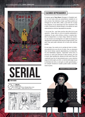 THRILLERVolumen %u00fanicoR%u00fastica. 15,2 x 22,9 cm. 220 p%u00e1gs. Blanco y negroPVP: 24,00 %u20ac %u2022 ISBN: 978-84-679-7381-5CAZANDO DEPREDADORESEl siempre genial Terry Moore (Strangers in Paradise) vuelve con una nueva serie que presentamos completa en un solo volumen. Nos referimos a Serial, que Moore public%u00f3 por entregas en los a%u00f1os 2021 y 2022, y que trata de un juego muy peligroso: el que desarrollan Zoe (esa inquietante ni%u00f1a a quien conocimos en Rachel Rising) y una asesina en serie especializada en eliminar depredadores sexuales. Y no es que Zoe %u2014que tiene muchos m%u00e1s a%u00f1os de los que aparenta%u2014 tenga nada en contra de asesinar pederastas o violadores. Es que, entre v%u00edctima y v%u00edctima, la asesina tambi%u00e9n ha despachado a su mejor amiga. Desde ese momento, Zoe iniciar%u00e1 una investigaci%u00f3n con objeto de averiguar la identidad de la psic%u00f3pata antes de que lo haga la polic%u00eda. %u00bfPor qu%u00e9? Pues para poder eliminarla de la forma m%u00e1s dolorosa posible. En ese juego, Zoe cuenta con la ventaja de tener la inofensiva apariencia de una ni%u00f1a de 10 a%u00f1os. Pero su adversaria lleva mucho tiempo cazando depredadores y ha desarrollado unas habilidades, digamos, %u201cespeciales%u201d (entre otras, la de borrar su rastro para dificultar la labor policial). %u00bfPor qu%u00e9 lo hace? %u00bfQu%u00e9 satisfacci%u00f3n obtiene de todo esto? Esas son cuestiones que Zoe ir%u00e1 descubriendo poco a poco mientras juega con ella al gato y al rat%u00f3n. Lo malo de este juego es que la identidad del rat%u00f3n y la del gato no est%u00e1n garantizadas, y en cualquier momento el cazador puede acabar convirti%u00e9ndose en presa.NOVEDADES ENERO 2025 %u2022 C%u00d3MIC AMERICANO P%u00c1G. 47 // PREVIEW EN LAS P%u00c1GINAS SIGUIENTESTERRY MOORESERIAL
