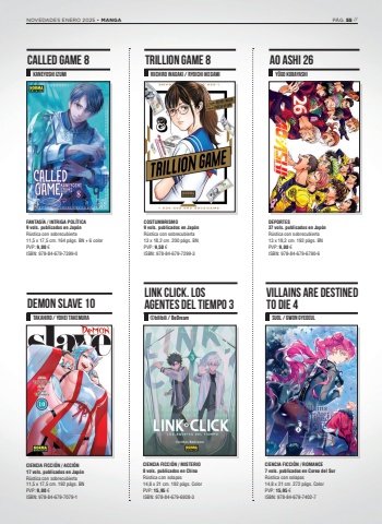 CIENCIA FICCI%u00d3N / ACCI%u00d3N17 vols. publicados en Jap%u00f3nR%u00fastica con sobrecubierta 11,5 x 17,5 cm. 192 p%u00e1gs. BNPVP: 9,00 %u20ac ISBN: 978-84-679-7079-1CIENCIA FICCI%u00d3N / MISTERIO8 vols. publicados en ChinaR%u00fastica con solapas14,8 x 21 cm. 192 p%u00e1gs. ColorPVP: 15,95 %u20ac ISBN: 978-84-679-6928-3CIENCIA FICCI%u00d3N / ROMANCE7 vols. publicados en Corea del SurR%u00fastica con solapas 14,8 x 21 cm. 272 p%u00e1gs. ColorPVP: 15,95 %u20ac ISBN: 978-84-679-7402-7LINK CLICK. LOS AGENTES DEL TIEMPO 3VILLAINS ARE DESTINED DEMON SLAVE 10 TO DIE 4TAKAHIRO / YOHEI TAKEMURA %u00a9bilibili / BeDream SUOL / GWON GYEOEULFANTAS%u00cdA / INTRIGA POL%u00cdTICA9 vols. publicados en Jap%u00f3nR%u00fastica con sobrecubierta 11,5 x 17,5 cm. 164 p%u00e1gs. BN + 6 color PVP: 9,00 %u20ac ISBN: 978-84-679-7399-0COSTUMBRISMO9 vols. publicados en Jap%u00f3nR%u00fastica con sobrecubierta 13 x 18,2 cm. 200 p%u00e1gs. BN PVP: 9,50 %u20ac ISBN: 978-84-679-7299-3DEPORTES37 vols. publicados en Jap%u00f3nR%u00fastica con sobrecubierta 13 x 18,2 cm. 192 p%u00e1gs. BN PVP: 9,00 %u20ac ISBN: 978-84-679-6790-6CALLED GAME 8 TRILLION GAME 8 AO ASHI 26KANEYOSHI IZUMI RIICHIRO INAGAKI / RYOICHI IKEGAMI Y%u00dbGO KOBAYASHINOVEDADES ENERO 2025 %u2022 MANGA P%u00c1G. 55 //