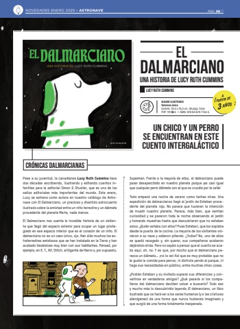Pese a su juventud, la canadiense Lucy Ruth Cummins lleva dos d%u00e9cadas escribiendo, ilustrando y editando cuentos infantiles para la editorial Simon & Shuster, que es uno de los sellos editoriales m%u00e1s importantes del mundo. Este enero, Lucy se estrena como autora en nuestro cat%u00e1logo de Astronave con El Dalmarciano, un precioso y divertido astrocuento ilustrado sobre la amistad entre un ni%u00f1o terrestre y un d%u00e1lmata procedente del planeta Marte, nada menos.El Dalmarciano nos cuenta la incre%u00edble historia de un visitante que lleg%u00f3 del espacio exterior para ocupar un lugar privilegiado en ese espacio interior que es el coraz%u00f3n de un ni%u00f1o. El dalmarciano no es un caso %u00fanico, ojo. Han sido muchos los extraterrestres amistosos que se han instalado en la Tierra y han acabado llev%u00e1ndose muy bien con sus habitantes. Pensad, por ejemplo, en E. T., Alf, Stitch, el Gigante de Hierro o, por supuesto, Superman. Frente a la mayor%u00eda de ellos, el dalmarciano puede pasar desapercibido en nuestro planeta porque %u00a1es casi igual que cualquier perro d%u00e1lmata con el que os cruc%u00e9is por la calle! Todo empez%u00f3 una noche de verano como tantas otras. Una expedici%u00f3n de dalmarcianos lleg%u00f3 al jard%u00edn de Esteban procedente del planeta rojo. No parece que tuvieran la intenci%u00f3n de invadir nuestro planeta. Parece, m%u00e1s bien, que sent%u00edan curiosidad y se pasaron toda la noche observando el jard%u00edn y tomando muestras hasta que descubrieron que no estaban solos. %u00bfQui%u00e9n estaba con ellos? Pues Esteban, que los espiaba desde la puerta de la cocina. La mayor%u00eda de los visitantes volvieron a su nave y salieron pitando. %u00bfTodos? No, uno de ellos se qued%u00f3 rezagado y, sin querer, sus compa%u00f1eros acabaron dej%u00e1ndolo atr%u00e1s. Pero no vay%u00e1is a pensar que el cuento se acaba aqu%u00ed, oh, no. Y es que, por mucho que el dalmarciano parezca un d%u00e1lmata... %u00a1no lo es! As%u00ed que es muy probable que no le guste la comida para perros, ni disfrute yendo al parque, ni haga sus necesidades en p%u00fablico, entre muchas otras cosas.%u00bfPodr%u00e1n Esteban y su invitado superar sus diferencias y convertirse en verdaderos amigos? %u00bfQu%u00e9 pasar%u00eda si los compa%u00f1eros del dalmarciano deciden volver a buscarlo? Todo eso y mucho m%u00e1s lo descubrir%u00e9is leyendo El dalmarciano, un libro ilustrado que os har%u00e1 ver a los seres humanos (y a las criaturas alien%u00edgenas) de una forma que nunca hubierais imaginado y que surgi%u00f3 de una forma totalmente inesperada. CR%u00d3NICAS DALMARCIANASELUNA HISTORIA DE LUCY RUTH CUMMINSDALMARCIANOLUCY RUTH CUMMINSUN CHICO Y UN PERRO SE ENCUENTRAN EN ESTE CUENTO INTERGAL%u00c1CTICOALBUM ILUSTRADOVolumen %u00fanicoCarton%u00e9. 25,4 x 25,4 cm. 48 p%u00e1gs. Color PVP: 17,95 %u20ac %u2022 ISBN: 978-84-679-7154-5A PARTIR DE3 A%u00d1OS NOVEDADES ENERO 2025 %u2022 ASTRONAVE P%u00c1G. 58 //