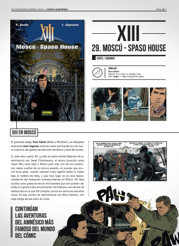 XIII EN MOSC%u00daEl guionista belga Yves Sente (Blake y Mortimer) y el dibujante moscovita Iouri Jugonov unen de nuevo sus fuerzas en una nueva aventura del agente secreto m%u00e1s amn%u00e9sico y letal del mundo. S%u00ed, este mes vuelve XIII, %u00a1y est%u00e1 en plena forma! Despu%u00e9s de su matrimonio con Janet Fitzsimmons, el ahora conocido como Jason Mac Lane viaja a Mosc%u00fa para atar uno de los numerosos cabos sueltos de su oscuro pasado, un suceso que ocurri%u00f3 hace a%u00f1os, cuando operaba como agente doble (o triple) bajo el nombre de Kelly, y que tuvo lugar en la casa Spaso, residencia del embajador estadounidense en Mosc%u00fa. All%u00ed dej%u00f3 ocultas unas grabaciones en microcasete que a%u00fan podr%u00edan ser %u00fatiles si supiera c%u00f3mo encontrarlas. As%u00ed empieza una carrera de obst%u00e1culos en la que XIII compite contra los servicios secretos rusos. En esa carrera se reencontrar%u00e1 con Nina Orekova, una vieja amiga de sus a%u00f1os en Cuba.SENTE / JIGOUNOVXIII29. MOSC%u00da - SPASO HOUSETHRILLERSerie abiertaCarton%u00e9. 21,5 x 28,5 cm. 48 p%u00e1gs. Color PVP: 18,00 %u20ac %u2022 ISBN: 978-84-679-7398-3CONTIN%u00daAN LAS AVENTURAS DEL AMN%u00c9SICO M%u00c1S FAMOSO DEL MUNDO DEL C%u00d3MICNOVEDADES ENERO 2025 %u2022 C%u00d3MIC EUROPEO P%u00c1G. 8 //