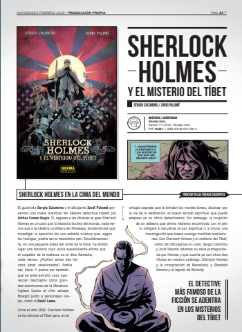 SHERLOCK HOLMES EN LA CIMA DEL MUNDOEl guionista Sergio Colomino y el dibujante Jordi Palom%u00e9 presentan una nueva aventura del c%u00e9lebre detective creado por Arthur Conan Doyle. S%u00ed, regresa a las librer%u00edas el gran Sherlock Holmes en un caso que lo llevar%u00e1 a la cima del mundo, nada menos que a la c%u00e9lebre cordillera del Himalaya, donde tendr%u00e1 que investigar la aparici%u00f3n de una extra%u00f1a criatura que, seg%u00fan los testigos, podr%u00eda ser el mism%u00edsimo yeti. Simult%u00e1neamente, en una peque%u00f1a aldea del norte de la India, ha tenido lugar una masacre cuya %u00fanica superviviente afirma que el culpable de la matanza es el dios Ganesha, nada menos. %u00bfPodr%u00edan estos dos hechos estar relacionados? Podr%u00eda ser, claro. Y podr%u00eda ser tambi%u00e9n que en este extra%u00f1o caso aparezcan mezclados otros grandes aventureros de la literatura inglesa (como el ni%u00f1o salvaje Mowgli) junto a personajes reales, como el Dal%u00e1i Lama.Corre el a%u00f1o 1892. Sherlock Holmes se ha retirado al T%u00edbet para, en el refugio sagrado que le brindan los monjes lamas, alcanzar por la v%u00eda de la meditaci%u00f3n un nuevo estado espiritual que pueda emplear en su oficio detectivesco. Sin embargo, la irrupci%u00f3n de un aldeano que afirma haberse encontrado con el yeti lo obligar%u00e1 a sacudirse la paz espiritual y a iniciar una investigaci%u00f3n que traer%u00e1 consigo ins%u00f3litas revelaciones. Con Sherlock Holmes y el misterio del T%u00edbet, c%u00f3mic de 160 p%u00e1ginas en color, Sergio Colomino y Jordi Palom%u00e9 retoman su serie protagonizada por Holmes y que cuenta ya con otros dos t%u00edtulos en nuestro cat%u00e1logo: Sherlock Holmes y la conspiraci%u00f3n de Barcelona, y Sherlock Holmes y el legado de Moriarty.SERGIO COLOMINO / JORDI PALOM%u00c9SHERLOCK HOLMESY EL MISTERIO DEL T%u00cdBETPREVIEW EN LAS P%u00c1GINAS SIGUIENTESMISTERIO / AVENTURASVolumen %u00fanicoCarton%u00e9. 17 x 26 cm. 160 p%u00e1gs. Color PVP: 28,00 %u20ac %u2022 ISBN: 978-84-679-7481-2EL DETECTIVE M%u00c1S FAMOSO DE LA FICCI%u00d3N SE ADENTRA EN LOS MISTERIOS DEL T%u00cdBETNOVEDADES FEBRERO 2025 %u2022 PRODUCCI%u00d3N PROPIA P%u00c1G. 21 //