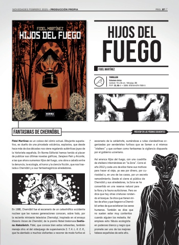 FANTASMAS DE CHERN%u00d3BILFidel Mart%u00ednez es un coloso del c%u00f3mic actual. Dibujante superlativo, es due%u00f1o de una pincelada volc%u00e1nica, explosiva, que desde hace m%u00e1s de dos d%u00e9cadas nos viene regalando aut%u00e9nticas joyas de la historieta espa%u00f1ola. En Norma Editorial hemos tenido el placer de publicar sus %u00faltimas novelas gr%u00e1ficas, Sarajevo Pain y Arconte, a las que ahora sumamos Hijos del fuego, una obra a caballo entre la denuncia, la ecolog%u00eda, el horror y la ciencia ficci%u00f3n, que nos traslada a Chern%u00f3bil y a sus fantasmag%u00f3ricos alrededores. En 1986, Chern%u00f3bil fue el escenario de un catastr%u00f3fico accidente nuclear que las nuevas generaciones conocen, sobre todo, por la reciente miniserie televisiva Chernobyl, inspirada en el ensayo literario Voces de Chern%u00f3bil, de la premio Nobel bielorrusa Svetlana Aleksi%u00e9vich. Fidel, que conoce bien estos referentes, tambi%u00e9n maneja otro: el del videojuego de supervivencia S. T. A. L. K. E. R., que ha alentado a muchos visitantes a recorrer de modo furtivo el escenario de la cat%u00e1strofe, sum%u00e1ndose a rutas clandestinas organizadas por senderistas furtivos que se llaman a s%u00ed mismos %u201cstalkers%u201d y que sortean como fantasmas la vigilancia dispuesta por el gobierno ucraniano.As%u00ed arranca Hijos del fuego, con una cuadrilla de stalkers intern%u00e1ndose en %u201cla Zona%u201d. Corre el a%u00f1o 2012 y cada uno de ellos tiene sus motivos para hacer el viaje, ya sea por dinero, por curiosidad o, en uno de los casos, por un secreto remordimiento. Desde el cierre al p%u00fablico de Chern%u00f3bil y sus alrededores, la Zona se ha convertido en una reserva natural para la flora y la fauna aut%u00f3ctonas. Pero se dice que hay otras criaturas rondando el bosque. Se dice que tienen miles de a%u00f1os y que llegaron a Chern%u00f3bil antes de que existieran los seres humanos. Tambi%u00e9n se dice que no suelen estar muy contentos cuando alguien los molesta. As%u00ed empieza esta f%u00e1bula ecologista en poderoso blanco y negro que promete ser uno de los mejores tebeos espa%u00f1oles de este a%u00f1o.FIDEL MART%u00cdNEZFUEGOHIJOS DELTHRILLERVolumen %u00fanicoCarton%u00e9. 19 x 26 cm. 160 p%u00e1gs. BNPVP: 23,95 %u20ac %u2022 ISBN: 978-84-679-7000-5PREVIEW EN LAS P%u00c1GINAS SIGUIENTESNOVEDADES FEBRERO 2025 %u2022 PRODUCCI%u00d3N PROPIA P%u00c1G. 27 //