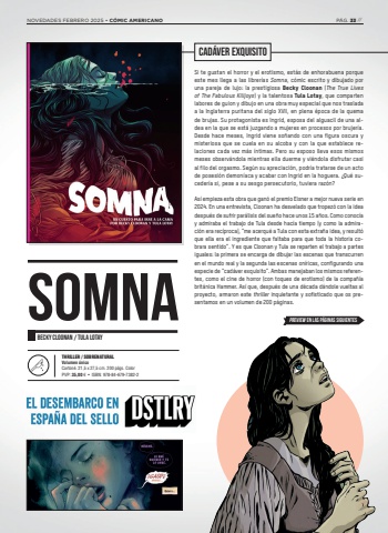 Si te gustan el horror y el erotismo, est%u00e1s de enhorabuena porque este mes llega a las librer%u00edas Somna, c%u00f3mic escrito y dibujado por una pareja de lujo: la prestigiosa Becky Cloonan (The True Lives of The Fabulous Killjoys) y la talentosa Tula Lotay, que comparten labores de guion y dibujo en una obra muy especial que nos traslada a la Inglaterra puritana del siglo XVII, en plena %u00e9poca de la quema de brujas. Su protagonista es Ingrid, esposa del alguacil de una aldea en la que se est%u00e1 juzgando a mujeres en procesos por brujer%u00eda. Desde hace meses, Ingrid viene so%u00f1ando con una figura oscura y misteriosa que se cuela en su alcoba y con la que establece relaciones cada vez m%u00e1s %u00edntimas. Pero su esposo lleva esos mismos meses observ%u00e1ndola mientras ella duerme y vi%u00e9ndola disfrutar casi al filo del orgasmo. Seg%u00fan su apreciaci%u00f3n, podr%u00eda tratarse de un acto de posesi%u00f3n demon%u00edaca y acabar con Ingrid en la hoguera. %u00bfQu%u00e9 suceder%u00eda si, pese a su sesgo persecutorio, tuviera raz%u00f3n? As%u00ed empieza esta obra que gan%u00f3 el premio Eisner a mejor nueva serie en 2024. En una entrevista, Cloonan ha desvelado que tropez%u00f3 con la idea despu%u00e9s de sufrir par%u00e1lisis del sue%u00f1o hace unos 15 a%u00f1os. Como conoc%u00eda y admiraba el trabajo de Tula desde hac%u00eda tiempo (y como la admiraci%u00f3n era rec%u00edproca), %u201cme acerqu%u00e9 a Tula con esta extra%u00f1a idea, y result%u00f3 que ella era el ingrediente que faltaba para que toda la historia cobrara sentido%u201d. Y es que Cloonan y Tula se reparten el trabajo a partes iguales: la primera se encarga de dibujar las escenas que transcurren en el mundo real y la segunda las escenas on%u00edricas, configurando una especie de %u201ccad%u00e1ver exquisito%u201d. Ambas manejaban los mismos referentes, como el cine de horror (con toques de erotismo) de la compa%u00f1%u00eda brit%u00e1nica Hammer. As%u00ed que, despu%u00e9s de una d%u00e9cada d%u00e1ndole vueltas al proyecto, armaron este thriller inquietante y sofisticado que os presentamos en un volumen de 200 p%u00e1ginas.CAD%u00c1VER EXQUISITOPREVIEW EN LAS P%u00c1GINAS SIGUIENTESTHRILLER / SOBRENATURALVolumen %u00fanicoCarton%u00e9. 21,5 x 27,5 cm. 200 p%u00e1gs. Color PVP: 35,00 %u20ac %u2022 ISBN: 978-84-679-7382-2BECKY CLOONAN / TULA LOTAYSOMNANOVEDADES FEBRERO 2025 %u2022 C%u00d3MIC AMERICANO P%u00c1G. 33 //
