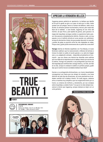 Jugyeong parece perfecta en apariencia. La belleza que destila es tal que la gente se gira a su paso al verla por la calle, todos quieren ser sus amigos, tener su n%u00famero de tel%u00e9fono, estar cerca de ella. Su atractivo parece inconsciente y natural, pero nada m%u00e1s lejos de la realidad%u2026 a cara lavada, Jugyeong es una chica del mont%u00f3n, de ojos finos y piel repleta de granos, pero gracias a la magia del maquillaje consigue cambiar su apariencia hasta parecer otra persona completamente distinta. Gracias a esto, es muy popular y en el instituto afronta el curso escolar con optimismo, aunque le atormenta el temor de que puedan descubrir su secreto y perder de golpe su posici%u00f3n entre las m%u00e1s deseadas en redes. Porque claro %u00bfqui%u00e9n podr%u00eda enamorarse de un patito feo como ella?Yaongyi aterriza en librer%u00edas espa%u00f1olas con True Beauty, el nuevo fen%u00f3meno webtoon que ha revolucionado a millones de lectores e incluso ha dado la vuelta al mundo gracias a su serie de imagen real y a su adaptaci%u00f3n animada %u2014disponible actualmente en Crunchyroll%u2014 que nos ofrece una historia tan divertida como adictiva que nos habla de la importancia de la belleza interior por encima de la exterior. Yaongyi nos presenta a una protagonista que hace uso del maquillaje para sentirse bien consigo misma y, con ello, ser feliz en la vida, aunque no siempre le saldr%u00e1 a la primera porque %u00bfqui%u00e9n dijo que el camino hacia la verdadera belleza fuera f%u00e1cil? Gracias a su protagonista dicharachera y su humor desenfadado conseguimos una trama que nos atrapa sin remedio y nos hace disfrutar de todo tipo de situaciones, as%u00ed como plantearnos el verdadero sentido de la belleza interior. Sin duda alguna, estamos ante un manhwa muy simp%u00e1tico que nos enganchar%u00e1 tanto por su humor, su romance de instituto y, obviamente, por sus consejos sobre maquillaje y cuidado facial. Y es que en la vida siempre buscamos lo mismo que Jugyeong, aunque siempre es mejor con un cutis perfecto.APRECIAR LA VERDADERA BELLEZACOSTUMBRISMO / ROMANCE(1 de 19)R%u00fastica con solapas. 14,8 x 21 cm. 288 p%u00e1gs. Color PVP: 15,95 %u20ac %u2022 ISBN: 978-84-679-7409-6YAONGYITRUE BEAUTY 1NOVEDADES FEBRERO 2025 %u2022 MANGA P%u00c1G. 45 // PREVIEW EN LAS P%u00c1GINAS SIGUIENTES