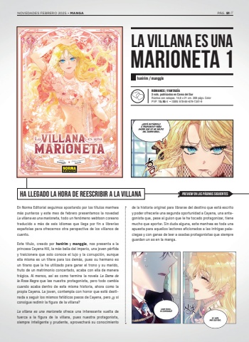 HA LLEGADO LA HORA DE REESCRIBIR A LA VILLANAhanirim / manggleLA VILLANA ES UNAMARIONETA 1En Norma Editorial seguimos apostando por los t%u00edtulos manhwa m%u00e1s punteros y este mes de febrero presentamos la novedad La villana es una marioneta, todo un fen%u00f3meno webtoon coreano traducido a m%u00e1s de seis idiomas que llega por fin a librer%u00edas espa%u00f1olas para ofrecernos otra perspectiva de los villanos de cuento. Este t%u00edtulo, creado por hanirim y manggle, nos presenta a la princesa Cayena Hill, la m%u00e1s bella del imperio, una joven p%u00e9rfida y traicionera que solo conoce el lujo y la corrupci%u00f3n, aunque ella misma es un t%u00edtere para los dem%u00e1s, pues su hermano es un tirano que la ha utilizado para ganar el trono y su marido, fruto de un matrimonio concertado, acaba con ella de manera tr%u00e1gica. Al menos, as%u00ed es como termina la novela La Dama de la Rosa Negra que lee nuestra protagonista, pero todo cambia cuando acaba dentro de esta misma historia, ahora como la propia Cayena. La joven, contempla con horror que est%u00e1 destinada a seguir los mismos fat%u00eddicos pasos de Cayena, pero %u00bfy si consigue redimir la figura de la villana? La villana es una marioneta ofrece una interesante vuelta de tuerca a la figura de la villana, pues nuestra protagonista, siempre inteligente y prudente, aprovechar%u00e1 su conocimiento de la historia original para librarse del destino que est%u00e1 escrito y poder ofrecerle una segunda oportunidad a Cayena, una antagonista que, pese al guion que le ha tocado protagonizar, tiene mucho que aportar. Sin duda alguna, este manhwa es toda una apuesta para aquellos lectores aficionados a las intrigas palaciegas y con ganas de leer a osadas protagonistas que siempre guardan un as en la manga. ROMANCE / FANTAS%u00cdA3 vols. publicados en Corea del SurR%u00fastica con solapas. 14,8 x 21 cm. 308 p%u00e1gs. ColorPVP: 15,95 %u20ac %u2022 ISBN: 978-84-679-7341-9PREVIEW EN LAS P%u00c1GINAS SIGUIENTESNOVEDADES FEBRERO 2025 %u2022 MANGA P%u00c1G. 51 //