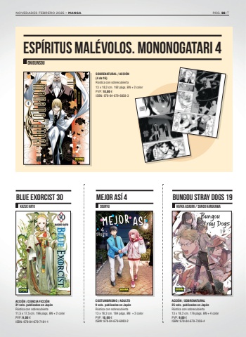 ACCI%u00d3N / CIENCIA FICCI%u00d3N31 vols. publicados en Jap%u00f3nR%u00fastica con sobrecubierta 11,5 x 17,5 cm. 196 p%u00e1gs. BN + 2 color PVP: 9,00 %u20ac ISBN: 978-84-679-7181-1BLUE EXORCIST 30KAZUE KATOSOBRENATURAL / ACCI%u00d3N(4 de 16)R%u00fastica con sobrecubierta 13 x 18,2 cm. 192 p%u00e1gs. BN + 2 color PVP: 10,00 %u20ac ISBN: 978-84-679-6858-3ESP%u00cdRITUS MAL%u00c9VOLOS. MONONOGATARI 4ONIGUNSOUCOSTUMBRISMO / ADULTO9 vols. publicados en Jap%u00f3nR%u00fastica con sobrecubierta 13 x 18,2 cm. 184 p%u00e1gs. BN + 2 colorPVP: 10,00 %u20ac ISBN: 978-84-679-6983-2MEJOR AS%u00cd 4SOURYUACCI%u00d3N / SOBRENATURAL25 vols. publicados en Jap%u00f3nR%u00fastica con sobrecubierta 13 x 18,2 cm. 176 p%u00e1gs. BN + 4 color PVP: 9,00 %u20ac ISBN: 978-84-679-7359-4BUNGOU STRAY DOGS 19KAFKA ASAGIRI / SANGO HARUKAWANOVEDADES FEBRERO 2025 %u2022 MANGA P%u00c1G. 56 //