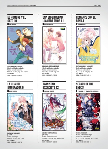 FANTAS%u00cdA / ROMANCE(9 de 13)R%u00fastica con solapas14,8 x 21 cm. 252 p%u00e1gs. Color PVP: 16,95 %u20ac ISBN: 978-84-679-6527-8COSTUMBRISMO / HUMOR14 vols. publicados en Jap%u00f3nR%u00fastica con sobrecubierta14,8 x 21 cm. 168 p%u00e1gs. BN + 6 color PVP: 9,50 %u20ac ISBN: 978-84-679-6544-5ACCI%u00d3N / FANTAS%u00cdA33 vols. publicados en Jap%u00f3nR%u00fastica con sobrecubierta 11,5 x 17,5 cm. 180 p%u00e1gs. BN + 4 color PVP: 9,00 %u20ac ISBN: 978-84-679-6907-8COSTUMBRISMO / ROMANCE6 vols. publicados en Jap%u00f3nR%u00fastica con sobrecubierta 11,5 x 17,5 cm. 176 p%u00e1gs. BN PVP: 9,00 %u20ac ISBN: 978-84-679-7427-0T. KAGAMI / Y. YAMAMOTO / D. FURUYARIN MIKIMOTORINO / YUNSULUMI SAKURAIACCI%u00d3N / SOBRENATURAL(22 de 35)R%u00fastica con sobrecubierta 11,5 x 17,5 cm. 188 p%u00e1gs. BN + 2 color PVP: 9,00 %u20ac ISBN: 978-84-679-6523-0TWIN STAR EXORCISTS 22YOSHIAKI SUKENOROMANCE / COSTUMBRISMO16 vols. publicados en Jap%u00f3nR%u00fastica con sobrecubierta 11,5 x 17,5 cm. 192 p%u00e1gs. BN PVP: 9,00 %u20ac ISBN: 978-84-679-7430-0UNA ENFERMEDAD LLAMADA AMOR 11MEGUMI MORINOSERAPH OF THE END 24ROMANCE CON EL RAYO 4LA HIJA DEL EMPERADOR 9EL HOMBRE Y EL GATO 10NOVEDADES FEBRERO 2025 %u2022 MANGA P%u00c1G. 57 //