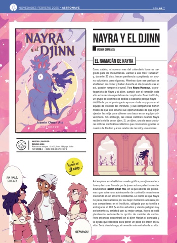 Como sab%u00e9is, el noveno mes del calendario lunar es sagrado para los musulmanes. Llaman a ese mes %u201cramad%u00e1n%u201d y, durante 30 d%u00edas, hacen penitencia cumpliendo un ayuno voluntario, pero riguroso. Mientras dure ese per%u00edodo se abstienen de comer y beber durante el d%u00eda (cuando cae el sol, pueden romper el ayuno). Para Nayra Mansour, la protagonista de Nayra y el djinn, cumplir con el ramad%u00e1n este a%u00f1o est%u00e1 siendo especialmente complicado. En el instituto, un grupo de alumnas se dedica a acosarla porque Nayra %u2014debilitada por el prolongado ayuno%u2014 rinde muy poco en el equipo de voleibol del instituto, y sus compa%u00f1eras tienen miedo de que eso arruine sus oportunidades de que alg%u00fan ojeador las elija para obtener una beca en un equipo universitario. Sin embargo, las cosas cambian cuando Nayra recibe la visita de un djinn. S%u00ed, un djinn, una de esas criaturas m%u00edticas del folklore isl%u00e1mico que conocemos gracias al cuento de Aladino y a los relatos de Las mil y una noches. As%u00ed empieza esta bell%u00edsima novela gr%u00e1fica para j%u00f3venes lectores y lectoras firmada por le joven autore palestino-estadounidense Iasmin Omar Ata, en la que aborda los problemas que sufre una adolescente de confesi%u00f3n musulmana creciendo en un entorno occidental. Lo cierto es que Nayra no pasa precisamente por su mejor momento: acosada por sus compa%u00f1eras en el instituto, obligada por su familia a entregarse al 100 % en los estudios y viendo peligrar muy seriamente su amistad con su mejor amiga, Nayra se est%u00e1 planteando seriamente la opci%u00f3n de cambiar de centro. Pero entonces encontrar%u00e1 en el djinn Marjan el consuelo y la ayuda que necesita para poner un poco de orden en su vida. Ser%u00e1, desde luego, el ramad%u00e1n m%u00e1s extra%u00f1o de su vida.EL RAMAD%u00c1N DE NAYRANAYRA Y EL DJINNIASMIN OMAR ATAAMISTAD / FANTAS%u00cdAVolumen %u00fanicoR%u00fastica con solapas. 15 x 22,5 cm. 256 p%u00e1gs. Color PVP: 22,95 %u20ac %u2022 ISBN: 978-84-679-7407-2A PARTIR DE9 A%u00d1OS NOVEDADES FEBRERO 2025 %u2022 ASTRONAVE P%u00c1G. 64 //