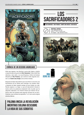 RICK REMENDER / MAX FIUMARA / ANDR%u00c9 LIMA ARA%u00daJO / DAVE MCCAIGLOS SACRIFICADORES 2AVENTURAS / FANTAS%u00cdA2 vols. publicados en EE. UU.R%u00fastica. 17 x 26 cm. 128 p%u00e1gs. Color PVP: 21,00 %u20ac %u2022 ISBN: 978-84-679-7529-1CR%u00d3NICA DE UN DEICIDIO ANUNCIADO%u00a1Este mes regresa a las librer%u00edas la serie m%u00e1s tr%u00e1gica, violenta y desenfrenada del guionista Rick Remender (Clase letal)! Nos referimos, claro est%u00e1, a Los sacrificadores, thriller de fantas%u00eda dibujado por Max Fiumara, que cuenta en este segundo volumen con Andr%u00e9 Lima Ara%u00fajo como artista invitado. Despu%u00e9s de haber descubierto que el sacrificio no era sino una herramienta de los dioses para prolongar sus propias vidas, y despu%u00e9s de haber logrado escapar de esa trampa con vida, Paloma regresa a su hogar. Lo que all%u00ed descubrir%u00e1 le llevar%u00e1 a luchar contra los poderosos empleando todo el poder que ha adquirido rob%u00e1ndolo a los mismos dioses que trataron de quitarle la vida. As%u00ed comienza este segundo volumen de Los sacrificadores, que contiene los episodios 7 a 11 de la serie original estadounidense.PALOMA INICIA LA REVOLUCI%u00d3NMIENTRAS SOLUNA DESCUBRE LA VIDA DE SUS S%u00daBDITOSNOVEDADES MARZO 2025 %u2022 C%u00d3MIC AMERICANO P%u00c1G. 36 //