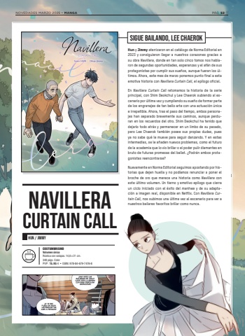 COSTUMBRISMOVolumen %u00fanicoR%u00fastica con solapas. 14,8 x 21 cm. 348 p%u00e1gs. ColorPVP: 15,95 %u20ac %u2022 ISBN: 978-84-679-7476-8SIGUE BAILANDO, LEE CHAEROKHun y Jimmy aterrizaron en el cat%u00e1logo de Norma Editorial en 2023 y consiguieron llegar a nuestros corazones gracias a su obra Navillera, donde en tan solo cinco tomos nos hablaron de segundas oportunidades, esperanzas y el af%u00e1n de sus protagonistas por cumplir sus sue%u00f1os, aunque fueran los %u00faltimos. Ahora, este mes de marzo ponemos punto final a esta emotiva historia con Navillera Curtain Call, el ep%u00edlogo oficial. En Navillera Curtain Call retomamos la historia de la serie principal, con Shim Deokchul y Lee Chaerok subiendo al escenario por %u00faltima vez y cumpliendo su sue%u00f1o de formar parte de los engranajes de tan bello arte con una actuaci%u00f3n %u00fanica e irrepetible. Ahora, tras el paso del tiempo, ambos personajes han separado brevemente sus caminos, aunque perduran en los recuerdos del otro. Shim Deokchul ha tenido que dejarlo todo atr%u00e1s y permanecer en un limbo de su pasado, pero Lee Chaerok tambi%u00e9n posee sus propias dudas, pues ya no sabe qu%u00e9 le mueve para seguir danzando. Y en estas intermedias, se le a%u00f1aden nuevos problemas, como el futuro de la academia que lo vio brillar o el poder pulir diamantes en bruto de futuras promesas del ballet. %u00bfPodr%u00e1n ambos protagonistas reencontrarse?Nuevamente en Norma Editorial seguimos apostando por historias que dejen huella y no pod%u00edamos renunciar a poner el broche de oro que merece una historia como Navillera con este %u00faltimo volumen. Un tierno y emotivo ep%u00edlogo que cierra un ciclo iniciado con el %u00e9xito del manhwa y de su adaptaci%u00f3n a imagen real, disponible en Netflix. Con Navillera Curtain Call, nos subimos una %u00faltima vez al escenario para ver a nuestros bailares favoritos brillar como nunca. HUN / JIMMYNAVILLERACURTAIN CALLNOVEDADES MARZO 2025 %u2022 MANGA P%u00c1G. 52 //