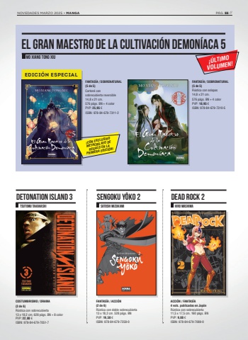 COSTUMBRISMO / DRAMA(3 de 6)R%u00fastica con sobrecubierta 13 x 18,2 cm. 628 p%u00e1gs. BN + 8 colorPVP: 22,00 %u20ac ISBN: 978-84-679-7051-7ACCI%u00d3N / FANTAS%u00cdA4 vols. publicados en Jap%u00f3nR%u00fastica con sobrecubierta 11,5 x 17,5 cm. 160 p%u00e1gs. BNPVP: 9,00 %u20ac ISBN: 978-84-679-7089-0DETONATION ISLAND 3 SENGOKU Y%u00d4KO 2 DEAD ROCK 2TSUTOMU TAKAHASHI Satoshi Mizukami HIRO MASHIMAFANTAS%u00cdA / ACCI%u00d3N(2 de 6)R%u00fastica con doble sobrecubierta13 x 18,2 cm. 528 p%u00e1gs. BNPVP: 19,50 %u20ac ISBN: 978-84-679-7258-0FANTAS%u00cdA / SOBRENATURAL(5 de 5)Carton%u00e9 con sobrecubierta reversible 14,8 x 21 cm. 576 p%u00e1gs. BN + 4 color PVP: 25,95 %u20ac ISBN: 978-84-679-7311-2FANTAS%u00cdA / SOBRENATURAL(5 de 5)R%u00fastica con solapas14,8 x 21 cm. 576 p%u00e1gs. BN + 4 color PVP: 18,95 %u20ac ISBN: 978-84-679-7310-5EL GRAN MAESTRO DE LA CULTIVACI%u00d3N DEMON%u00cdACA 5MO XIANG TONG XIU%u00a1CON EXCLUSIVOMETACRILATO DE REGALO EN LA PRIMERA EDICI%u00d3N!EDICI%u00d3N ESPECIAL%u00a1%u00daLTIMO VOLUMEN!NOVEDADES MARZO 2025 %u2022 MANGA P%u00c1G. 55 //
