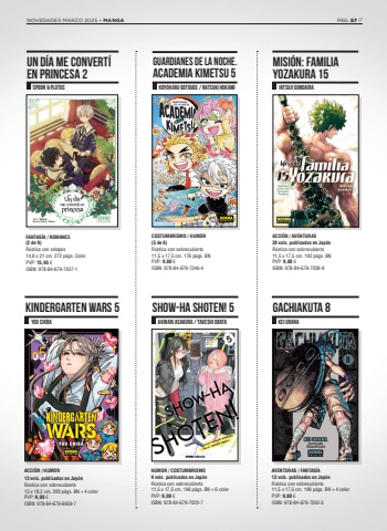 FANTAS%u00cdA / ROMANCE(2 de 9)R%u00fastica con solapas14,8 x 21 cm. 272 p%u00e1gs. Color PVP: 15,95 %u20ac ISBN: 978-84-679-7037-1ACCI%u00d3N / AVENTURAS28 vols. publicados en Jap%u00f3nR%u00fastica con sobrecubierta 11,5 x 17,5 cm. 192 p%u00e1gs. BN PVP: 9,00 %u20ac ISBN: 978-84-679-7028-9SPOON & PLUTUS HITSUJI GONDAIRACOSTUMBRISMO / HUMOR(5 de 6)R%u00fastica con sobrecubierta 11,5 x 17,5 cm. 176 p%u00e1gs. BN PVP: 9,00 %u20ac ISBN: 978-84-679-7346-4GUARDIANES DE LA NOCHE.ACADEMIA KIMETSU 5KOYOHARU GOTOUGE / NATSUKI HOKAMIMISI%u00d3N: FAMILIA YOZAKURA 15UN D%u00cdA ME CONVERT%u00cd EN PRINCESA 2ACCI%u00d3N / HUMOR13 vols. publicados en Jap%u00f3nR%u00fastica con sobrecubierta 13 x 18,2 cm. 200 p%u00e1gs. BN + 4 colorPVP: 9,00 %u20ac ISBN: 978-84-679-6959-7AVENTURAS / FANTAS%u00cdA13 vols. publicados en Jap%u00f3nR%u00fastica con sobrecubierta 11,5 x 17,5 cm. 190 p%u00e1gs. BN + 4 colorPVP: 9,00 %u20ac ISBN: 978-84-679-7202-3KINDERGARTEN WARS 5 SHOW-HA SHOTEN! 5 GACHIAKUTA 8YOU CHIBA AKINARI ASAKURA / TAKESHI OBATA KEI URANAHUMOR / COSTUMBRISMO9 vols. publicados en Jap%u00f3nR%u00fastica con sobrecubierta11,5 x 17,5 cm. 196 p%u00e1gs. BN + 6 colorPVP: 9,00 %u20ac ISBN: 978-84-679-7022-7NOVEDADES MARZO 2025 %u2022 MANGA P%u00c1G. 57 //