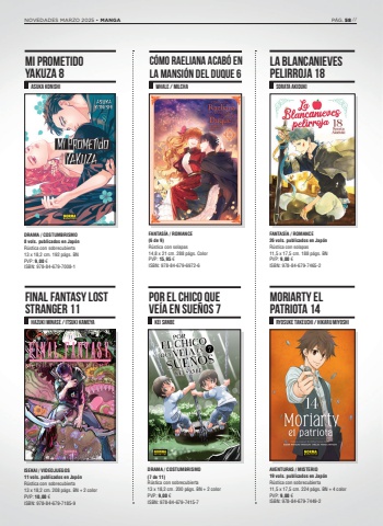 ISEKAI / VIDEOJUEGOS11 vols. publicados en Jap%u00f3nR%u00fastica con sobrecubierta 13 x 18,2 cm. 208 p%u00e1gs. BN + 2 colorPVP: 10,00 %u20ac ISBN: 978-84-679-7185-9DRAMA / COSTUMBRISMO8 vols. publicados en Jap%u00f3nR%u00fastica con sobrecubierta 13 x 18,2 cm. 192 p%u00e1gs. BN PVP: 9,00 %u20ac ISBN: 978-84-679-7008-1AVENTURAS / MISTERIO19 vols. publicados en Jap%u00f3nR%u00fastica con sobrecubierta 11,5 x 17,5 cm. 224 p%u00e1gs. BN + 4 color PVP: 9,00 %u20ac ISBN: 978-84-679-7449-2FANTAS%u00cdA / ROMANCE26 vols. publicados en Jap%u00f3nR%u00fastica con solapas 11,5 x 17,5 cm. 188 p%u00e1gs. BN PVP: 9,00 %u20ac ISBN: 978-84-679-7465-2RYOSUKE TAKEUCHI / HIKARU MIYOSHISORATA AkidukiHAZUKI MINASE / ITSUKI KAMEYAASUKA KONISHIDRAMA / COSTUMBRISMO(7 de 11)R%u00fastica con sobrecubierta 13 x 18,2 cm. 200 p%u00e1gs. BN + 2 colorPVP: 9,00 %u20ac ISBN: 978-84-679-7415-7POR EL CHICO QUE VE%u00cdA EN SUE%u00d1OS 7KEI SANBEFANTAS%u00cdA / ROMANCE(6 de 9)R%u00fastica con solapas14,8 x 21 cm. 288 p%u00e1gs. Color PVP: 15,95 %u20ac ISBN: 978-84-679-6972-6C%u00d3MO RAELIANA ACAB%u00d3 EN LA MANSI%u00d3N DEL DUQUE 6WHALE / MILCHAMORIARTY EL PATRIOTA 14LA BLANCANIEVES PELIRROJA 18FINAL FANTASY LOSTSTRANGER 11MI PROMETIDO YAKUZA 8NOVEDADES MARZO 2025 %u2022 MANGA P%u00c1G. 58 //