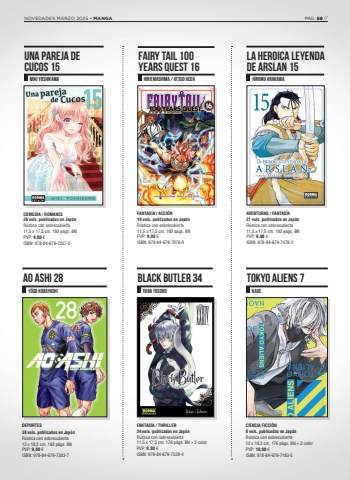 COMEDIA / ROMANCE26 vols. publicados en Jap%u00f3nR%u00fastica con sobrecubierta 11,5 x 17,5 cm. 192 p%u00e1gs. BN PVP: 9,00 %u20ac ISBN: 978-84-679-7357-0AVENTURAS / FANTAS%u00cdA21 vols. publicados en Jap%u00f3nR%u00fastica con sobrecubierta 11,5 x 17,5 cm. 192 p%u00e1gs. BN PVP: 9,00 %u20ac ISBN: 978-84-679-7478-2MIKI YOSHIKAWA HIROMU ARAKAWAFANTAS%u00cdA / ACCI%u00d3N19 vols. publicados en Jap%u00f3nR%u00fastica con sobrecubierta 11,5 x 17,5 cm. 192 p%u00e1gs. BN PVP: 9,00 %u20ac ISBN: 978-84-679-7076-0FAIRY TAIL 100 YEARS QUEST 16HIRO MASHIMA / ATSUO UEDALA HEROICA LEYENDA DE ARSLAN 15UNA PAREJA DE CUCOS 15DEPORTES38 vols. publicados en Jap%u00f3nR%u00fastica con sobrecubierta 13 x 18,2 cm. 192 p%u00e1gs. BN PVP: 9,00 %u20ac ISBN: 978-84-679-7303-7CIENCIA FICCI%u00d3N8 vols. publicados en Jap%u00f3nR%u00fastica con sobrecubierta 13 x 18,2 cm. 176 p%u00e1gs. BN + 2 colorPVP: 10,00 %u20ac ISBN: 978-84-679-7183-5AO ASHI 28 BLACK BUTLER 34 TOKYO ALIENS 7Y%u00dbGO KOBAYASHI YANA TOSOBO NAOEFANTAS%u00cdA / THRILLER34 vols. publicados en Jap%u00f3nR%u00fastica con sobrecubierta11,5 x 17,5 cm. 176 p%u00e1gs. BN + 2 colorPVP: 9,00 %u20ac ISBN: 978-84-679-7528-4NOVEDADES MARZO 2025 %u2022 MANGA P%u00c1G. 59 //