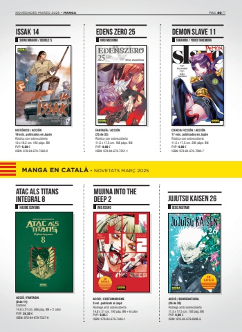 HIST%u00d3RICO / ACCI%u00d3N18 vols. publicados en Jap%u00f3nR%u00fastica con sobrecubierta13 x 18,2 cm. 192 p%u00e1gs. BN PVP: 9,00 %u20ac ISBN: 978-84-679-7360-0FANTAS%u00cdA / ACCI%u00d3N(25 de 33)R%u00fastica con sobrecubierta 11,5 x 17,5 cm. 188 p%u00e1gs. BN PVP: 9,00 %u20ac ISBN: 978-84-679-7251-1CIENCIA FICCI%u00d3N / ACCI%u00d3N17 vols. publicados en Jap%u00f3nR%u00fastica con sobrecubierta 11,5 x 17,5 cm. 200 p%u00e1gs. BN PVP: 9,00 %u20ac ISBN: 978-84-679-7080-7SHINJI MAKARI / DOUBLE-S HIRO MASHIMA TAKAHIRO / YOHEI TAKEMURAISSAK 14 EDENS ZERO 25 DEMON SLAVE 11MANGA EN CATAL%u00c0 %u2022 NOVETATS MAR%u00c7 2025ACCI%u00d3 / FANTASIA(8 de 11)Carton%u00e914,8 x 21 cm. 566 p%u00e0g. BN + 2 color PVP: 24,50 %u20ac ISBN: 978-84-679-7537-6ACCI%u00d3 / SOBRENATURAL(26 de 30)R%u00fastega amb sobrecoberta11,5 x 17,5 cm. 192 p%u00e0g. BN PVP: 9,00 %u20ac ISBN: 978-84-679-6998-6HAJIME ISAYAMA GEGE AKUTAMIACCI%u00d3 / COSTUMBRISME 3 vol. publicats al Jap%u00f3R%u00fastega amb sobrecoberta14,8 x 21 cm. 190 p%u00e0g. BN + 6 color PVP: 9,95 %u20ac ISBN: 978-84-679-7446-1MUJINA INTO THEDEEP 2INIO ASANOJUJUTSU KAISEN 26ATAC ALS TITANSINTEGRAL 8NOVEDADES MARZO 2025 %u2022 MANGA P%u00c1G. 60 //