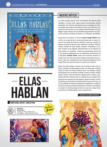 MUJERES M%u00cdTICASLos mitos griegos figuran entre las historias m%u00e1s %u00e9picas jam%u00e1s contadas. Lo tienen todo: magia, guerras interminables, amores imposibles. Son historias antiqu%u00edsimas que se contaban en la Grecia antigua hace m%u00e1s de tres milenios. Hace unos 2700 a%u00f1os, adquirieron forma escrita en tres poemas important%u00edsimos que han llegado hasta nuestros d%u00edas transmitidos de generaci%u00f3n en generaci%u00f3n: la Il%u00edada y la Odisea, de Homero, y la Teogon%u00eda, de Hes%u00edodo. Sobre estos tres pilares, la escritora Honor Cargill-Martin firma un libro en el que da voz a ocho personajes que no suelen tenerla en las obras de Homero y Hes%u00edodo, y que aqu%u00ed cuentan su historia en primera persona. Nos referimos a Pandora, Medusa, Ariadna, Helena de Troya, Medea, Atalanta, Pentesilea y Circe, ocho mujeres cuya biograf%u00eda descubriremos en las p%u00e1ginas de Ellas hablan, el %u201castrolibro%u201d infantil que presentamos este mes y que aparece embellecido por las magn%u00edficas ilustraciones de la dibujante Camelia Pham. Estas ocho historias muestran el reverso de unos mitos que sol%u00edan olvidarse del papel de las mujeres o, peor a%u00fan, presentarlas como villanas de segunda. Honor Cargill-Martin les permite contar su versi%u00f3n de la historia. Seg%u00fan los mitos griegos, Pandora fue la primera mujer sobre la tierra y tambi%u00e9n la responsable de abrir una tinaja que conten%u00eda todos los males del mundo. Medusa ten%u00eda una cabellera repleta de serpientes que convert%u00edan en piedra a quien la miraba. Ariadna ayud%u00f3 a Teseo a salir del laberinto. Medea ayud%u00f3 a Jas%u00f3n a apoderarse del m%u00edtico vellocino de oro. Atalanta era una cazadora que particip%u00f3 en la persecuci%u00f3n del peligroso jabal%u00ed de Calid%u00f3n. El amor de Helena por el pr%u00edncipe Paris desencaden%u00f3 la guerra de Troya, en la que particip%u00f3 la amazona Pentesilea encabezando un ej%u00e9rcito. Circe era una bruja que estaba dispuesta a convertir a los hombres en cerdos con tal de proteger la isla en la que viv%u00eda. Todas ten%u00edan sus motivos y en Ellas hablan vamos a descubrirlos.HONOR CARGILL-MARTIN / CAMELIA PHAMELLASHABLAN PREVIEW EN LAS P%u00c1GINAS SIGUIENTESMITOLOG%u00cdAVolumen %u00fanicoCarton%u00e9. 24 x 28 cm. 80 p%u00e1gs. Color PVP: 20,95 %u20ac %u2022 ISBN: 978-84-679-3941-5A PARTIR DE9 A%u00d1OS NOVEDADES MARZO 2025 %u2022 ASTRONAVE P%u00c1G. 61 //