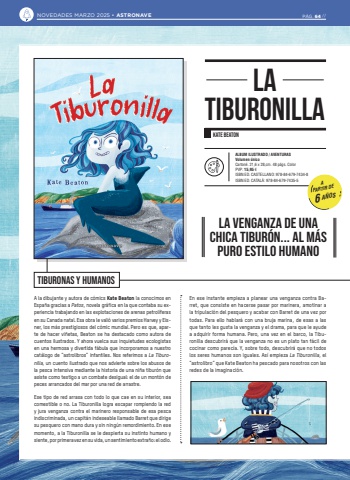 A la dibujante y autora de c%u00f3mics Kate Beaton la conocimos en Espa%u00f1a gracias a Patos, novela gr%u00e1fica en la que contaba su experiencia trabajando en las explotaciones de arenas petrol%u00edferas en su Canada natal. Esa obra le vali%u00f3 varios premios Harvey y Eisner, los m%u00e1s prestigiosos del c%u00f3mic mundial. Pero es que, aparte de hacer vi%u00f1etas, Beaton se ha destacado como autora de cuentos ilustrados. Y ahora vuelca sus inquietudes ecologistas en una hermosa y divertida f%u00e1bula que incorporamos a nuestro cat%u00e1logo de %u201castrolibros%u201d infantiles. Nos referimos a La Tiburonilla, un cuento ilustrado que nos advierte sobre los abusos de la pesca intensiva mediante la historia de una ni%u00f1a tibur%u00f3n que asiste como testigo a un combate desigual: el de un mont%u00f3n de peces arrancados del mar por una red de arrastre. Ese tipo de red arrasa con todo lo que cae en su interior, sea comestible o no. La Tiburonilla logra escapar rompiendo la red y jura venganza contra el marinero responsable de esa pesca indiscriminada, un capit%u00e1n indeseable llamado Barret que dirige su pesquero con mano dura y sin ning%u00fan remordimiento. En ese momento, a la Tiburonilla se le despierta su instinto humano y siente, por primera vez en su vida, un sentimiento extra%u00f1o: el odio. En ese instante empieza a planear una venganza contra Barret, que consiste en hacerse pasar por marinera, amotinar a la tripulaci%u00f3n del pesquero y acabar con Barret de una vez por todas. Para ello hablar%u00e1 con una bruja marina, de esas a las que tanto les gusta la venganza y el drama, para que le ayude a adquirir forma humana. Pero, una vez en el barco, la Tiburonilla descubrir%u00e1 que la venganza no es un plato tan f%u00e1cil de cocinar como parec%u00eda. Y, sobre todo, descubrir%u00e1 que no todos los seres humanos son iguales. As%u00ed empieza La Tiburonilla, el %u201castrolibro%u201d que Kate Beaton ha pescado para nosotros con las redes de la imaginaci%u00f3n.TIBURONAS Y HUMANOSLA TIBURONILLAKATE BEATONALBUM ILUSTRADO / AVENTURASVolumen %u00fanicoCarton%u00e9. 21,6 x 28,cm. 48 p%u00e1gs. Color PVP: 15,95 %u20acISBN ED. CASTELLANO: 978-84-679-7434-8ISBN ED. CATAL%u00c0: 978-84-679-7435-5 A PARTIR DE6 A%u00d1OS LA VENGANZA DE UNA CHICA TIBUR%u00d3N... AL M%u00c1S PURO ESTILO HUMANONOVEDADES MARZO 2025 %u2022 ASTRONAVE P%u00c1G. 64 //