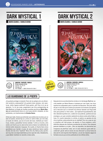 %u00bfTe gustar%u00eda proteger el planeta Tierra de los peligros de una dimensi%u00f3n sombr%u00eda y amenazante? %u00bfTe gustar%u00eda tener poderes, vivir aventuras, visitar lugares ex%u00f3ticos? Suena genial, %u00bfeh? Pero no lo es en absoluto. Y si no me crees, preg%u00fantale a las cinco protagonistas de Dark Mystical, la trilog%u00eda de novelas juveniles escrita por Marta %u00c1lvarez que presentamos ahora en una nueva edici%u00f3n completa, en dos vol%u00famenes, con ilustraciones de Charles Deroo. Antes que nada, tienes que entender que existen dos mundos: por un lado el nuestro, donde hay luz y reina un cierto Orden; por otro lado, el mundo de Umbria, que es el mundo del Caos, habitado por monstruos, miedos y pesadillas hechas realidad. Y entre un mundo y otro existe una Puerta que los aberrantes (as%u00ed se llaman los habitantes de Umbria) est%u00e1n deseando traspasar. Por suerte, la Puerta tiene cinco guardianas que impiden el paso de esos monstruos hacia nuestro mundo. Son las cinco %u201cmystical%u201d: Nora, Erin, Iris, Hana y Luna, que llevan muy mal una responsabilidad que les cay%u00f3 del cielo, literalmente, y que deben mantener en secreto a toda costa. Despu%u00e9s de los acontecimientos vividos en la tetralog%u00eda Mystical, escrita tambi%u00e9n por Marta %u00c1lvarez e ilustrada por Laia L%u00f3pez, las cinco mystical se preparaban para un per%u00edodo de descanso. Pero ese ratito de paz no era m%u00e1s que la calma que precede a la tormenta. De repente van a descubrir que un cantante muy famoso llamado Leo Sings est%u00e1 listo para publicar un libro sobre%u2026 %u00a1las mystical! Supuestamente, ese libro desvelar%u00e1 qui%u00e9nes son, cu%u00e1les son sus poderes, qui%u00e9nes son sus enemigos y en qu%u00e9 consiste realmente la eterna lucha entre Orden y Caos. En cuanto descubren la noticia, el p%u00e1nico se apodera de las cinco mystical. %u00bfQu%u00e9 pretende Leo en realidad? Pero las cosas se van a complicar a%u00fan m%u00e1s porque, de repente, la Tierra empieza a sufrir distintos ataques de criaturas procedentes de Umbria. Esos ataques parecen obedecer a un plan%u2026 %u00a1Pero es imposible, los aberrantes son incapaces de planificar nada, son el caos absoluto! %u00bfQu%u00e9 est%u00e1 sucediendo? %u00bfQui%u00e9n est%u00e1 al mando de esa ofensiva? La %u00fanica forma de descubrirlo ser%u00e1 leyendo Dark Mystical, una de las mejores sagas de fantas%u00eda oscura que se han publicado en los %u00faltimos a%u00f1os.DARK MYSTICAL 1 DARK MYSTICAL 2MARTA %u00c1LVAREZ / CHARLES DEROO MARTA %u00c1LVAREZ / CHARLES DEROOLAS GUARDIANAS DE LA PUERTAAMISTAD / FANTAS%u00cdA / NOVELA Segundo volumen de tresCarton%u00e9. 15 x 22 cm. 272 p%u00e1gs. BNPVP: 21,95 %u20ac %u2022 ISBN: 978-84-679-7437-9AMISTAD / FANTAS%u00cdA / NOVELA Primer volumen de tresCarton%u00e9. 15 x 22 cm. 248 p%u00e1gs. BNPVP: 21,95 %u20ac %u2022 ISBN: 978-84-679-7436-2A PARTIR DE12 A%u00d1OS NOVEDADES MARZO 2025 %u2022 ASTRONAVE P%u00c1G. 66 //
