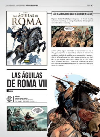El genial Enrico Marini (Rapaces) regresa a tu librer%u00eda favorita con una nueva entrega de Las %u00e1guilas de Roma, el mejor p%u00e9plum actual del c%u00f3mic francobelga. Arminio y Falco siguen empe%u00f1ados en tropezarse el uno con el otro, ya que Arminio ha alcanzado el estatus de l%u00edder en una cambiante coalici%u00f3n de pueblos germanos opuestos a la expansi%u00f3n de la Roma Imperial (y a todos los que colaboran con ella). Pero es que, adem%u00e1s, tiene como reh%u00e9n al hijo de Falco, quien se ha propuesto rescatarlo a toda costa. As%u00ed empieza el pen%u00faltimo %u00e1lbum de esta emocionante serie de aventuras al m%u00e1s puro estilo de Gladiator.LOS DESTINOS CRUZADOS DE ARMINIO Y FALCOP%u00c9PLUMS%u00e9ptimo volumen de ochoCarton%u00e9. 22 x 29,5 cm. 64 p%u00e1gs. Color PVP: 18,00 %u20ac %u2022 ISBN: 978-84-679-7535-2MARINILAS %u00c1GUILASDE ROMA VIINOVEDADES MARZO 2025 %u2022 C%u00d3MIC EUROPEO P%u00c1G. 8 //