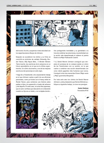 del mundo. Acci%u00f3n y suspense a toda velocidad con los espectaculares dibujos de Johnson.Despu%u00e9s se sucedieron los %u00e9xitos y su firma se convirti%u00f3 en sin%u00f3nimo de calidad: Extremity, Murder Falcon, Billy Rayos Beta%u2026 O Wonder Woman: Tierra muerta, las aventuras de la amazona en un futuro apocal%u00edptico en el que es la %u00faltima superhero%u00edna. Un c%u00f3mic alucinante y una de las mejores aventuras del personaje en este siglo.Y lleg%u00f3 Do a Powerbomb!, otro sorprendente trabajo en el que Johnson vuelve a partir de sus aficiones personales, como ya hiciera con el heavy metal en Murder Falcon, para contarnos una historia sobre padres e hijos y la superaci%u00f3n a trav%u00e9s del esfuerzo y del deporte. En este caso, la lucha libre japonesa, que el autor confiesa que descubri%u00f3 en la televisi%u00f3n cuando su hija era un beb%u00e9 y %u00abno le dejaba dormir%u00bb. Una protagonista inolvidable y su genialidad a la hora de combinar las emociones y la emotividad con la acci%u00f3n m%u00e1s desenfrenada le valieron el premio Eisner a la Mejor Publicaci%u00f3n Juvenil.Y s%u00ed, Daniel Warren Johnson consigui%u00f3 que rompiera mi promesa de no comprar jam%u00e1s un c%u00f3mic de los Transformers con su versi%u00f3n, en la que vuelve a combinar esa acci%u00f3n desenfrenada con unos robots gigantes m%u00e1s humanos que nunca. Consigui%u00f3 otros dos merecidos Eisner (Mejor serie y Mejor guionista/dibujante).Por todo esto amo los c%u00f3mics de Daniel Warren Johnson y estoy deseando que Norma Editorial publique su siguiente trabajo, La luna nos persigue.Jes%u00fas Jim%u00e9nezPeriodista RTVEC%u00d3MIC AMERICANO %u2022 OTO%u00d1O 2025 P%u00c1G. 102 //