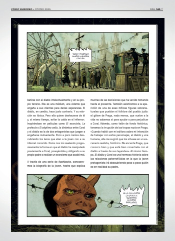 batirse con el diablo intelectualmente y en su propio terreno. Ella es una m%u00e9dium, una vidente que enga%u00f1a a sus clientes para darles esperanzas. El diablo, en cambio, hace justo contrario. Y su relaci%u00f3n es t%u00f3xica. Pero ella quiere deshacerse de %u00e9l y, al mismo tiempo, evitar la ca%u00edda en el infierno%u00bb. Inspir%u00e1ndose en pel%u00edculas como El exorcista, La profec%u00eda o El s%u00e9ptimo sello, la din%u00e1mica entre Coral y el diablo es la de dos antagonistas que juegan a enga%u00f1arse mutuamente. Poco a poco iremos descubriendo los lazos que atan a la joven con a su infernal conocido. Homs nos ir%u00e1 revelando progresivamente la forma en que el diablo ha manipulado previamente a Coral, posey%u00e9ndola y obligando a su propio padre a realizar un exorcismo que acab%u00f3 mal. A trav%u00e9s de una serie de flashbacks, conoceremos la biograf%u00eda de la joven, hecho que explica muchas de las decisiones que ha venido tomando hasta el presente. Tambi%u00e9n asistiremos a la aparici%u00f3n de una de esas m%u00edticas figuras sobrenaturales que pueblan el folklore del pueblo jud%u00edo: el g%u00f3lem de Praga, nada menos, que vuelve a la vida no sabemos si para ayudar o para perjudicar a Coral. Adem%u00e1s, como tel%u00f3n de fondo hist%u00f3rico, tenemos la irrupci%u00f3n de las tropas nazis en Praga. %u00abCuando habl%u00e9 con mi editora sobre mi intenci%u00f3n de trabajar con estos personajes, el diablo y una humana, ella me sugiri%u00f3 que los situase en un escenario realista, hist%u00f3rico. Me encanta Praga, que conozco bien y que est%u00e1 bien conectada con el diablo a trav%u00e9s de sus leyendas%u00bb. Al mismo tiempo, El diablo y Coral es una hermosa historia sobre las relaciones paternofiliales en la que la joven protagonista ir%u00e1 descubriendo poco a poco qui%u00e9n es en realidad su padre.C%u00d3MIC EUROPEO %u2022 OTO%u00d1O 2025 P%u00c1G. 140 //