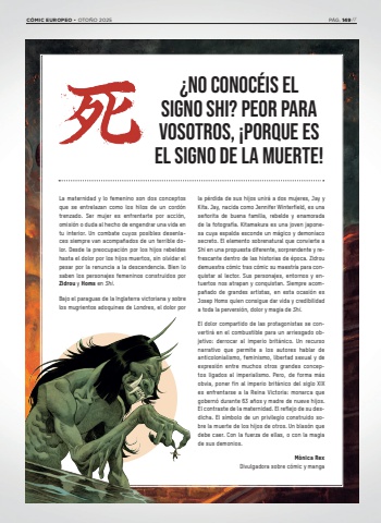 La maternidad y lo femenino son dos conceptos que se entrelazan como los hilos de un cord%u00f3n trenzado. Ser mujer es enfrentarte por acci%u00f3n, omisi%u00f3n o duda al hecho de engendrar una vida en tu interior. Un combate cuyos posibles desenlaces siempre van acompa%u00f1ados de un terrible dolor. Desde la preocupaci%u00f3n por los hijos rebeldes hasta el dolor por los hijos muertos, sin olvidar el pesar por la renuncia a la descendencia. Bien lo saben los personajes femeninos construidos por Zidrou y Homs en Shi. Bajo el paraguas de la Inglaterra victoriana y sobre los mugrientos adoquines de Londres, el dolor por la p%u00e9rdida de sus hijos unir%u00e1 a dos mujeres, Jay y Kita. Jay, nacida como Jennifer Winterfield, es una se%u00f1orita de buena familia, rebelde y enamorada de la fotograf%u00eda. Kitamakura es una joven japonesa cuya espalda esconde un m%u00e1gico y demon%u00edaco secreto. El elemento sobrenatural que convierte a Shi en una propuesta diferente, sorprendente y refrescante dentro de las historias de %u00e9poca. Zidrou demuestra c%u00f3mic tras c%u00f3mic su maestr%u00eda para conquistar al lector. Sus personajes, entornos y entuertos nos atrapan y conquistan. Siempre acompa%u00f1ado de grandes artistas, en esta ocasi%u00f3n es Josep Homs quien consigue dar vida y credibilidad a toda la perversi%u00f3n, dolor y magia de Shi. El dolor compartido de las protagonistas se convertir%u00e1 en el combustible para un arriesgado objetivo: derrocar al imperio brit%u00e1nico. Un recurso narrativo que permite a los autores hablar de anticolonialismo, feminismo, libertad sexual y de expresi%u00f3n entre muchos otros grandes conceptos ligados al imperialismo. Pero, de forma m%u00e1s obvia, poner fin al imperio brit%u00e1nico del siglo XIX es enfrentarse a la Reina Victoria: monarca que gobern%u00f3 durante 63 a%u00f1os y madre de nueve hijos. El contraste de la maternidad. El reflejo de su desdicha. El s%u00edmbolo de un privilegio construido sobre la muerte de los hijos de otros. Un blas%u00f3n que debe caer. Con la fuerza de ellas, o con la magia de sus demonios.M%u00f2nica RexDivulgadora sobre c%u00f3mic y manga%u00bfNO CONOC%u00c9IS EL SIGNO SHI? PEOR PARA VOSOTROS, %u00a1PORQUE ES EL SIGNO DE LA MUERTE! C%u00d3MIC EUROPEO %u2022 OTO%u00d1O 2025 P%u00c1G. 149 //