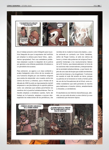 de un trabajo precario como fot%u00f3grafo para la polic%u00eda (despu%u00e9s de que lo expulsaran del instituto por emplear la c%u00e1mara para hacer fotos%u2026 ejem%u2026 menos apropiadas). Pero sus verdaderos problemas empiezan cuando lo despiden de la polic%u00eda por ganarse unos d%u00f3lares pas%u00e1ndole chivatazos a un periodista de sucesos. Para sobrevivir, se agarra a un clavo ardiendo y acaba trabajando como chico de los recados en una funeraria dirigida por una fan%u00e1tica religiosa que acaba de emprender una cruzada contra los c%u00f3mics de horror y cr%u00edmenes, que a finales de la d%u00e9cada de 1940 (%u00a1y esto es rigurosamente cierto!) empezaron a ser percibidos por la opini%u00f3n p%u00fablica como una amenaza que estaba pervirtiendo los cerebros de la juventud estadounidense. Pero la mara%u00f1a empieza a enredarse cuando, harto del trabajo en la funeraria, empieza a recorrer desesperado las redacciones de los peri%u00f3dicos y las revistas de la ciudad en busca de empleo, y acaba entrando en contacto con Victor Venables, editor de Proper Comics, el sello de c%u00f3mics de horror y crimen m%u00e1s poderoso de la %u00e9poca (transparente homenaje a los revolucionarios tebeos de la EC Comics, que desencadenaron la furia de los sectores m%u00e1s conservadores y bienpensantes de la sociedad estadounidense, y que fueron objeto de una caza de brujas que acab%u00f3 borr%u00e1ndolos para de los kioscos y los drugstores). Y entonces es cuando el nudo del enredo se cierra, porque su patrona en la funeraria lo invita a formar parte de uno de los Escuadrones de la Virtud, unos comit%u00e9s ciudadanos que est%u00e1 poniendo en marcha para dedicarse a incautar c%u00f3mics, amedrentando a chavales y a vendedores. El resultado es una historia maravillosa que, adem%u00e1s, es una carta de amor a unos c%u00f3mics (y a sus creadores) que marcaron %u00e9poca.C%u00d3MIC EUROPEO %u2022 OTO%u00d1O 2025 P%u00c1G. 152 //