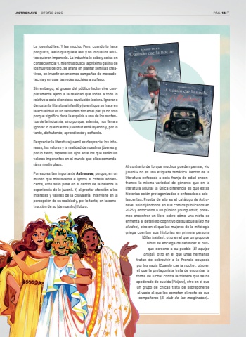 La juventud lee. Y lee mucho. Pero, cuando lo hace por gusto, lee lo que quiere leer y no lo que los adultos quieren imponerle. La industria lo sabe y act%u00faa en consecuencia; y, mientras busca la pr%u00f3xima gallina de los huevos de oro, se afana en plantar semillas creativas, en invertir en enormes campa%u00f1as de mercadotecnia y en usar las redes sociales a su favor.Sin embargo, el grueso del p%u00fablico lector vive completamente ajeno a la realidad que rodea a todo lo relativo a esta silenciosa revoluci%u00f3n lectora. Ignorar o denostar la literatura infantil y juvenil que se hace en la actualidad es un verdadero tiro en el pie: ya no solo porque significa darle la espalda a uno de los sustentos de la industria, sino porque, adem%u00e1s, nos lleva a ignorar lo que nuestra juventud est%u00e1 leyendo y, por lo tanto, disfrutando, aprendiendo y so%u00f1ando. Despreciar la literatura juvenil es despreciar los intereses, los valores y la realidad de nuestros j%u00f3venes y, por lo tanto, taparse los ojos ante los que ser%u00e1n los valores imperantes en el mundo que ellos comandar%u00e1n a medio plazo.Por eso es tan importante Astronave; porque, en un mundo que minusvalora e ignora el criterio adolescente, este sello pone en el centro de la balanza la experiencia de lo juvenil. Y, al prestar atenci%u00f3n a los intereses y valores de la chavaler%u00eda, interviene en la percepci%u00f3n de su realidad y, por lo tanto, en la construcci%u00f3n de su (de nuestro) futuro.Al contrario de lo que muchos puedan pensar, %u00ablo juvenil%u00bb no es una etiqueta tem%u00e1tica. Dentro de la literatura enfocada a esta franja de edad encontramos la misma variedad de g%u00e9neros que en la literatura adulta; la %u00fanica diferencia es que estas historias est%u00e1n protagonizadas o enfocadas a adolescentes. Prueba de ello es el cat%u00e1logo de Astronave: solo fij%u00e1ndonos en sus comics publicados en 2025 y enfocados a un p%u00fablico young adult, podemos encontrar un libro sobre c%u00f3mo una nieta se enfrenta al deterioro cognitivo de su abuela (No me olvides), otro en el que las mujeres de la mitolog%u00eda griega cuentan sus historias en primera persona (Ellas hablan), otro en el que un grupo de ni%u00f1os se encarga de defender el bosque cercano a su pueblo (El equipo ortiga), otro en el que unas hermanas tratan de sobrevivir a la Francia ocupada por los nazis (Cuando cae la noche), otro en el que la protagonista trata de encontrar la forma de luchar contra la tristeza que se ha apoderado de su vida (Vulpes), otro en el que un grupo de chicas trata de sobreponerse al vac%u00edo al que les someten el resto de sus compa%u00f1eros (El club de las marginadas)%u2026 ASTRONAVE %u2022 OTO%u00d1O 2025 P%u00c1G. 14 //