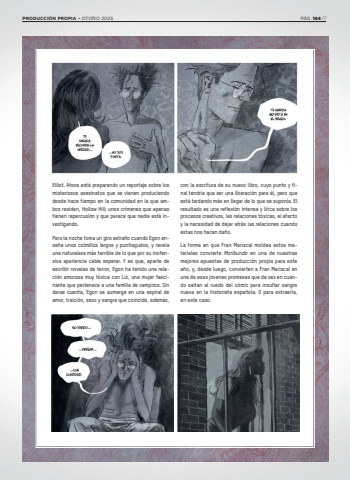 Elliot. Ahora est%u00e1 preparando un reportaje sobre los misteriosos asesinatos que se vienen produciendo desde hace tiempo en la comunidad en la que ambos residen, Hollow Hill; unos cr%u00edmenes que apenas tienen repercusi%u00f3n y que parece que nadie est%u00e1 investigando. Pero la noche toma un giro extra%u00f1o cuando Egon ense%u00f1a unos colmillos largos y puntiagudos, y revela una naturaleza m%u00e1s terrible de lo que por su inofensiva apariencia cab%u00eda esperar. Y es que, aparte de escribir novelas de terror, Egon ha tenido una relaci%u00f3n amorosa muy t%u00f3xica con Liz, una mujer fascinante que pertenece a una familia de vampiros. Sin darse cuenta, Egon se sumerge en una espiral de amor, traici%u00f3n, sexo y sangre que coincide, adem%u00e1s, con la escritura de su nuevo libro, cuyo punto y final tendr%u00eda que ser una liberaci%u00f3n para %u00e9l, pero que est%u00e1 tardando m%u00e1s en llegar de lo que se supon%u00eda. El resultado es una reflexi%u00f3n intensa y l%u00edrica sobre los procesos creativos, las relaciones t%u00f3xicas, el afecto y la necesidad de dejar atr%u00e1s las relaciones cuando estas nos hacen da%u00f1o. La forma en que Fran Mariscal moldea estos materiales convierte Moribundo en una de nuestras mejores apuestas de producci%u00f3n propia para este a%u00f1o, y, desde luego, convierten a Fran Mariscal en una de esas j%u00f3venes promesas que de vez en cuando saltan al ruedo del c%u00f3mic para insuflar sangre nueva en la historieta espa%u00f1ola. O para extraerla, en este caso.PRODUCCI%u00d3N PROPIA %u2022 OTO%u00d1O 2025 P%u00c1G. 164 //