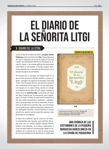 Corr%u00eda el mes de octubre de 2010 y Joaquim Aubert Puigarnau, m%u00e1s conocido como Kim, Premio Nacional del C%u00f3mic, dibujante de El arte de volar y El ala rota, creador del desopilante Mart%u00ednez el facha para la revista El Jueves, y de novelas gr%u00e1ficas tan personales como Nieve en los bolsillos o Fouch%u00e9, el genio tenebroso, paseaba por el mercado de Els Encants, en el barcelon%u00e9s barrio de las Gl%u00f2ries. Els Encants es un mercado de trastos viejos en el que es f%u00e1cil encontrar objetos ins%u00f3litos y, previo regateo, conseguir un capricho de ensue%u00f1o a muy bajo costo. A Kim le gusta recorrer los puestos y pasar el rato revolviendo libros viejos. En uno de esos puestos tropez%u00f3 con un diario %u00edntimo, escrito en catal%u00e1n en la Espa%u00f1a de los a%u00f1os 40 y 50. Seg%u00fan confiesa la autora (una tal se%u00f1orita Litgi), se trata de una copia del diario original que ha manuscrito para regal%u00e1rsela a su novio. El diario le llam%u00f3 tanto la atenci%u00f3n a Kim que acab%u00f3 compr%u00e1ndolo, ley%u00e9ndolo, y adapt%u00e1ndolo al arte que mejor domina: la historieta. El resultado es El diario de la se%u00f1orita Litgi, una maravillosa novela gr%u00e1fica que combina historieta, memoria %u00edntima, desenga%u00f1o amoroso, cr%u00f3nica hist%u00f3rica e incluso autoficci%u00f3n, puesto que el propio Kim aparece como personaje en sus p%u00e1ginas.El diario de la se%u00f1orita Litgi se centra en el romance clandestino, casi secreto, que mantiene Mercedes Litgi con un hombre casado llamado Manolo. Gracias a las entradas en el diario, seguiremos el curso de esta aventura extraconyugal desde su nacimiento en la piscina de un club de tenis situado en una zona residencial de Barcelona en 1938 hasta EL DIARIO DELA SE%u00d1ORITA LITGI%u203a DIARIO DE LA OTRAVolumen %u00fanico. Carton%u00e9. 19 x 26 cm. 128 p%u00e1gs. BNPVP por determinar. ISBN: 978-84-679-7872-8Fecha de publicaci%u00f3n: Noviembre 2025KIMUNA CR%u00d3NICA DE LAS COSTUMBRES DE LA PEQUE%u00d1A BURGUES%u00cdA BARCELONESA ENLA ESPA%u00d1A DE POSGUERRA%u00a9 Kim, 2025CUBIERTA NO DEFINITIVAPRODUCCI%u00d3N PROPIA %u2022 OTO%u00d1O 2025 P%u00c1G. 173 //