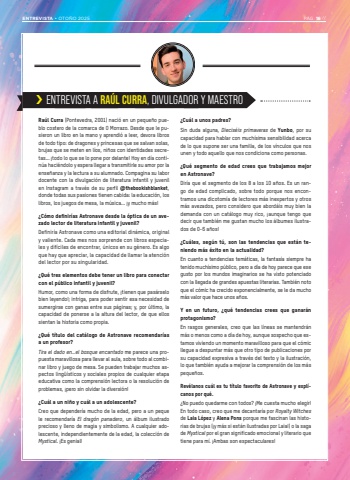 Ra%u00fal Curra (Pontevedra, 2001) naci%u00f3 en un peque%u00f1o pueblo costero de la comarca de O Morrazo. Desde que le pusieron un libro en la mano y aprendi%u00f3 a leer, devora libros de todo tipo: de dragones y princesas que se salvan solas, brujas que se meten en l%u00edos, ni%u00f1os con identidades secretas... %u00a1todo lo que se lo pone por delante! Hoy en d%u00eda contin%u00faa haci%u00e9ndolo y espera llegar a transmitirle su amor por la ense%u00f1anza y la lectura a su alumnado. Compagina su labor docente con la divulgaci%u00f3n de literatura infantil y juvenil en Instagram a trav%u00e9s de su perfil @thebookishblanket, donde todas sus pasiones tienen cabida: la educaci%u00f3n, los libros, los juegos de mesa, la m%u00fasica... %u00a1y mucho m%u00e1s!%u00bfC%u00f3mo definir%u00edas Astronave desde la %u00f3ptica de un avezado lector de literatura infantil y juvenil?Definir%u00eda Astronave como una editorial din%u00e1mica, original y valiente. Cada mes nos sorprende con libros especiales y dif%u00edciles de encontrar, %u00fanicos en su g%u00e9nero. Es algo que hay que apreciar, la capacidad de llamar la atenci%u00f3n del lector por su singularidad.%u00bfQu%u00e9 tres elementos debe tener un libro para conectar con el p%u00fablico infantil y juvenil?Humor, como una forma de disfrute, %u00a1tienen que pas%u00e1rselo bien leyendo!; intriga, para poder sentir esa necesidad de sumergirse con ganas entre sus p%u00e1ginas; y, por %u00faltimo, la capacidad de ponerse a la altura del lector, de que ellos sientan la historia como propia.%u00bfQu%u00e9 t%u00edtulo del cat%u00e1logo de Astronave recomendar%u00edas a un profesor?Tira el dado en%u2026el bosque encantado me parece una propuesta maravillosa para llevar al aula, sobre todo al combinar libro y juego de mesa. Se pueden trabajar muchos aspectos ling%u00fc%u00edsticos y sociales propios de cualquier etapa educativa como la comprensi%u00f3n lectora o la resoluci%u00f3n de problemas, %u00a1pero sin olvidar la diversi%u00f3n!%u00bfCu%u00e1l a un ni%u00f1o y cu%u00e1l a un adolescente?Creo que depender%u00eda mucho de la edad, pero a un peque le recomendar%u00eda El drag%u00f3n panadero, un %u00e1lbum ilustrado precioso y lleno de magia y simbolismo. A cualquier adolescente, independientemente de la edad, la colecci%u00f3n de Mystical. %u00a1Es genial!%u00bfCu%u00e1l a unos padres?Sin duda alguna, Diecis%u00e9is primaveras de Yunbo, por su capacidad para hablar con much%u00edsima sensibilidad acerca de lo que supone ser una familia, de los v%u00ednculos que nos unen y todo aquello que nos condiciona como personas.%u00bfQu%u00e9 segmento de edad crees que trabajamos mejor en Astronave?Dir%u00eda que el segmento de los 8 a los 10 a%u00f1os. Es un rango de edad complicado, sobre todo porque nos encontramos una dicotom%u00eda de lectores m%u00e1s inexpertos y otros m%u00e1s avezados, pero considero que abord%u00e1is muy bien la demanda con un cat%u00e1logo muy rico, %u00a1aunque tengo que decir que tambi%u00e9n me gustan mucho los %u00e1lbumes ilustrados de 0-6 a%u00f1os!%u00bfCu%u00e1les, seg%u00fan t%u00fa, son las tendencias que est%u00e1n teniendo m%u00e1s %u00e9xito en la actualidad?En cuanto a tendencias tem%u00e1ticas, la fantas%u00eda siempre ha tenido much%u00edsimo p%u00fablico, pero a d%u00eda de hoy parece que ese gusto por los mundos imaginarios se ha visto potenciado con la llegada de grandes apuestas literarias. Tambi%u00e9n noto que el c%u00f3mic ha crecido exponencialmente, se le da mucho m%u00e1s valor que hace unos a%u00f1os.Y en un futuro, %u00bfqu%u00e9 tendencias crees que ganar%u00e1n protagonismo?En rasgos generales, creo que las l%u00edneas se mantendr%u00e1n m%u00e1s o menos como a d%u00eda de hoy, aunque sospecho que estamos viviendo un momento maravilloso para que el c%u00f3mic llegue a despuntar m%u00e1s que otro tipo de publicaciones por su capacidad expresiva a trav%u00e9s del texto y la ilustraci%u00f3n, lo que tambi%u00e9n ayuda a mejorar la comprensi%u00f3n de los m%u00e1s peque%u00f1os.Rev%u00e9lanos cu%u00e1l es tu t%u00edtulo favorito de Astronave y expl%u00edcanos por qu%u00e9.%u00bfNo puedo quedarme con todos? %u00a1Me cuesta mucho elegir! En todo caso, creo que me decantar%u00eda por Royalty Witches de Laia L%u00f3pez y Alena Pons porque me fascinan las historias de brujas (%u00a1y m%u00e1s si est%u00e1n ilustradas por Laia!) o la saga de Mystical por el gran significado emocional y literario que tiene para m%u00ed. %u00a1Ambas son espectaculares!%u203a ENTREVISTA A RA%u00daL CURRA, DIVULGADOR Y MAESTROENTREVISTA %u2022 OTO%u00d1O 2025 P%u00c1G. 16 //