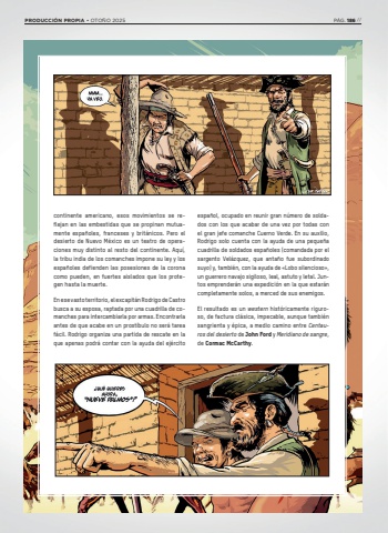 continente americano, esos movimientos se reflejan en las embestidas que se propinan mutuamente espa%u00f1oles, franceses y brit%u00e1nicos. Pero el desierto de Nuevo M%u00e9xico es un teatro de operaciones muy distinto al resto del continente. Aqu%u00ed, la tribu india de los comanches impone su ley y los espa%u00f1oles defienden las posesiones de la corona como pueden, en fuertes aislados que los protegen hasta la muerte. En ese vasto territorio, el excapit%u00e1n Rodrigo de Castro busca a su esposa, raptada por una cuadrilla de comanches para intercambiarla por armas. Encontrarla antes de que acabe en un prost%u00edbulo no ser%u00e1 tarea f%u00e1cil. Rodrigo organiza una partida de rescate en la que apenas podr%u00e1 contar con la ayuda del ej%u00e9rcito espa%u00f1ol, ocupado en reunir gran n%u00famero de soldados con los que acabar de una vez por todas con el gran jefe comanche Cuerno Verde. En su auxilio, Rodrigo solo cuenta con la ayuda de una peque%u00f1a cuadrilla de soldados espa%u00f1oles (comandada por el sargento Vel%u00e1zquez, que anta%u00f1o fue subordinado suyo) y, tambi%u00e9n, con la ayuda de %u00abLobo silencioso%u00bb, un guerrero navajo sigiloso, leal, astuto y letal. Juntos emprender%u00e1n una expedici%u00f3n en la que estar%u00e1n completamente solos, a merced de sus enemigos. El resultado es un western hist%u00f3ricamente riguroso, de factura cl%u00e1sica, impecable, aunque tambi%u00e9n sangrienta y %u00e9pica, a medio camino entre Centauros del desierto de John Ford y Meridiano de sangre, de Cormac McCarthy.PRODUCCI%u00d3N PROPIA %u2022 OTO%u00d1O 2025 P%u00c1G. 186 //
