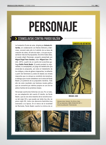 La fundaci%u00f3n El arte de volar, dirigida por Antonio Altarriba, en colaboraci%u00f3n con Norma Editorial y Edelvives, convoc%u00f3 este a%u00f1o la II edici%u00f3n de su beca de creaci%u00f3n de c%u00f3mic %u00abEl arte de volar%u00bb, a la que se presentaron m%u00e1s de 50 propuestas. De entre todas ellas, el jurado eligi%u00f3 Personaje, proyecto presentado por Miguel %u00c1ngel Teso Canales, alias %u00abMiguel Can%u00bb (Madrid, 1974), a partir de un cuento de la escritora gallega Emilia Pardo Baz%u00e1n. El jurado ponder%u00f3 la originalidad, la complejidad y el juego de metaficci%u00f3n que encerraba la propuesta, as%u00ed como el tratamiento de los c%u00f3digos y roles de g%u00e9nero imperantes, la reflexi%u00f3n a partir del feminismo (y sobre %u00e9l) desde una mirada masculina que no rehuye su condici%u00f3n de monstruo, el di%u00e1logo que el autor establece con la obra de Pardo Baz%u00e1n y la potencia de su propuesta narrativa. Todo ello da como resultado una hermosa novela gr%u00e1fica que se convertir%u00e1 por m%u00e9ritos propios en uno de los platos fuertes de los pr%u00f3ximos meses.Personaje cuenta dos historias a la vez. Por un lado, es una adaptaci%u00f3n del cuento El indulto, de Pardo Baz%u00e1n, que es una obra maestra de la narrativa breve del siglo XIX y que puede ser le%u00edda hoy d%u00eda, en pleno siglo XXI, como una denuncia feminista muy avanzada a su %u00e9poca. En el marco de la localidad de Marineda, Pardo Baz%u00e1n cuenta la cr%u00f3nica de un PERSONAJE%u203a STANISLAVSKI CONTRA PARDO BAZ%u00c1NVolumen %u00fanico. Carton%u00e9. 19 x 26 cm. ColorPVP por determinar. ISBN: 978-84-679-7871-1Fecha de publicaci%u00f3n: Pr%u00f3ximamenteMIGUEL CAN%u00a9 Miguel CanCUBIERTA NO DEFINITIVAPRODUCCI%u00d3N PROPIA %u2022 OTO%u00d1O 2025 P%u00c1G. 195 //