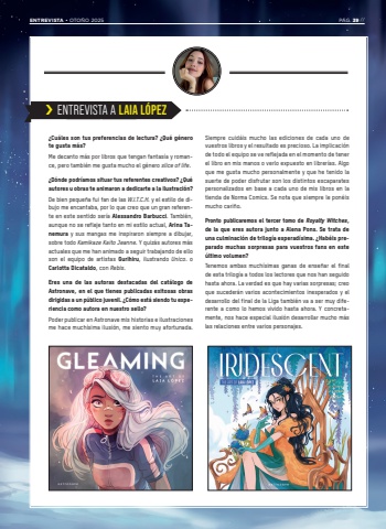 %u00bfCu%u00e1les son tus preferencias de lectura? %u00bfQu%u00e9 g%u00e9nero te gusta m%u00e1s?Me decanto m%u00e1s por libros que tengan fantas%u00eda y romance, pero tambi%u00e9n me gusta mucho el g%u00e9nero slice of life.%u00bfD%u00f3nde podr%u00edamos situar tus referentes creativos? %u00bfQu%u00e9 autores u obras te animaron a dedicarte a la ilustraci%u00f3n?De bien peque%u00f1a fui fan de las W.I.T.C.H. y el estilo de dibujo me encantaba, por lo que creo que un gran referente en este sentido ser%u00eda Alessandro Barbucci. Tambi%u00e9n, aunque no se refleje tanto en mi estilo actual, Arina Tanemura y sus mangas me inspiraron siempre a dibujar, sobre todo Kamikaze Kaito Jeanne. Y quiz%u00e1s autores m%u00e1s actuales que me han animado a seguir trabajando de ello son el equipo de artistas Gurihiru, ilustrando Unico. o Carlotta Dicataldo, con Rebis.Eres una de las autoras destacadas del cat%u00e1logo deAstronave, en el que tienes publicadas exitosas obras dirigidas a un p%u00fablico juvenil. %u00bfC%u00f3mo est%u00e1 siendo tu experiencia como autora en nuestro sello?Poder publicar en Astronave mis historias e ilustraciones me hace much%u00edsima ilusi%u00f3n, me siento muy afortunada. Siempre cuid%u00e1is mucho las ediciones de cada uno de vuestros libros y el resultado es precioso. La implicaci%u00f3n de todo el equipo se ve reflejada en el momento de tener el libro en mis manos o verlo expuesto en librer%u00edas. Algo que me gusta mucho personalmente y que he tenido la suerte de poder disfrutar son los distintos escaparates personalizados en base a cada uno de mis libros en la tienda de Norma Comics. Se nota que siempre le pon%u00e9is mucho cari%u00f1o.Pronto publicaremos el tercer tomo de Royalty Witches,de la que eres autora junto a Alena Pons. Se trata de una culminaci%u00f3n de trilog%u00eda esperad%u00edsima. %u00bfHab%u00e9is preparado muchas sorpresas para vuestros fans en este %u00faltimo volumen?Tenemos ambas much%u00edsimas ganas de ense%u00f1ar el final de esta trilog%u00eda a todos los lectores que nos han seguido hasta ahora. La verdad es que hay varias sorpresas; creo que suceder%u00e1n varios acontecimientos inesperados y el desarrollo del final de la Liga tambi%u00e9n va a ser muy diferente a como lo hemos vivido hasta ahora. Y concretamente, nos hace especial ilusi%u00f3n desarrollar mucho m%u00e1s las relaciones entre varios personajes.%u203a ENTREVISTA A LAIA L%u00d3PEZENTREVISTA %u2022 OTO%u00d1O 2025 P%u00c1G. 39 //