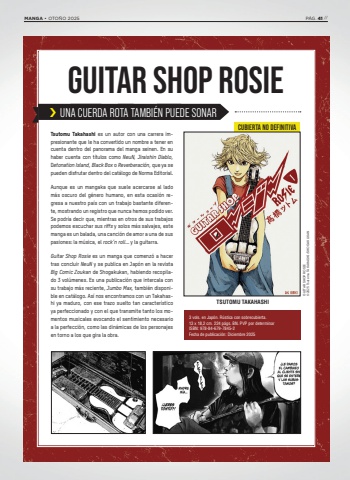 Tsutomu Takahashi es un autor con una carrera impresionante que le ha convertido un nombre a tener en cuenta dentro del panorama del manga seinen. En su haber cuenta con t%u00edtulos como NeuN, Jiraishin Diablo, Detonation Island, Black Box o Reverberaci%u00f3n, que ya se pueden disfrutar dentro del cat%u00e1logo de Norma Editorial.Aunque es un mangaka que suele acercarse al lado m%u00e1s oscuro del g%u00e9nero humano, en esta ocasi%u00f3n regresa a nuestro pa%u00eds con un trabajo bastante diferente, mostrando un registro que nunca hemos podido ver. Se podr%u00eda decir que, mientras en otros de sus trabajos podemos escuchar sus riffs y solos m%u00e1s salvajes, este manga es un balada, una canci%u00f3n de amor a una de sus pasiones: la m%u00fasica, el rock%u2019n roll... y la guitarra. Guitar Shop Rosie es un manga que comenz%u00f3 a hacer tras concluir NeuN y se publica en Jap%u00f3n en la revista Big Comic Zoukan de Shogakukan, habiendo recopilado 3 vol%u00famenes. Es una publicaci%u00f3n que intercala con su trabajo m%u00e1s reciente, Jumbo Max, tambi%u00e9n disponible en cat%u00e1logo. As%u00ed nos encontramos con un Takahashi ya maduro, con ese trazo suelto tan caracter%u00edstico ya perfeccionado y con el que transmite tanto los momentos musicales evocando el sentimiento necesario a la perfecci%u00f3n, como las din%u00e1micas de los personajes en torno a los que gira la obra.3 vols. en Jap%u00f3n. R%u00fastica con sobrecubierta. 13 x 18,2 cm. 224 p%u00e1gs. BN. PVP por determinarISBN: 978-84-679-7845-2Fecha de publicaci%u00f3n: Diciembre 2025GUITAR SHOP ROSIEGUITAR SHOP ROSIE%u00a9%ufe0f2025 Tsutomu TAKAHASHI/SHOGAKUKANTSUTOMU TAKAHASHI%u203a UNA CUERDA ROTA TAMBI%u00c9N PUEDE SONARCUBIERTA NO DEFINITIVAMANGA %u2022 OTO%u00d1O 2025 P%u00c1G. 41 //