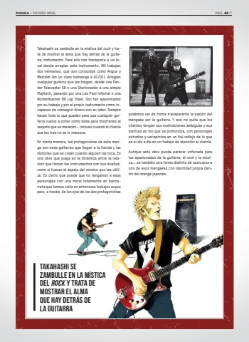 Takahashi se zambulle en la m%u00edstica del rock y trata de mostrar el alma que hay detr%u00e1s de la guitarra instrumento. Para ello nos transporta a un local donde arreglan este instrumento. All%u00ed trabajan dos hermanos, que son conocidos como Angus y Malcolm (en un claro homenaje a AC/DC). Arreglan cualquier guitarra que les traigan, desde una Fender Telecaster 58 o una Startocaster a una simple Playtech, pasando por una Les Paul Infernal o una Rockenbacker B6 Lap Steel. Son tan apasionados por su trabajo y por el propio instrumento como incapaces de conseguir dinero con su labor. Siempre hacen todo lo que puedan para que cualquier guitarra vuelva a sonar como debe para mostrarles el respeto que se merecen... incluso cuando el cliente que las trae no se lo merezca. En cierta manera, las protagonistas de este manga son esas guitarras que llegan a la tienda y las historias que se crean cuando alguien las toca. Es una obra que juega en la din%u00e1mica entre la relaci%u00f3n que tienen los instrumentos con sus due%u00f1os, como si fueran el espejo del m%u00fasico que las utiliza. Es cierto que puede que no tengamos a esos personajes con una moral totalmente en bancarrota que hemos visto en anteriores trabajos suyos pero, a trav%u00e9s, de los ojos de los dos protagonistas podemos ver de forma transparente la pasi%u00f3n del mangaka por la guitarra. Y eso no quita que los clientes tengan sus motivaciones ambiguas y sus matices en los que se profundiza, con personajes extra%u00f1os y variopintos en un fiel reflejo de lo que es el d%u00eda a d%u00eda en un trabajo de atenci%u00f3n al cliente.Aunque esta obra pueda parecer enfocada para los apasionados de la guitarra, el rock y la m%u00fasica... es tambi%u00e9n una forma distinta de acercarse a uno de esos mangakas con identidad propia dentro del manga japon%u00e9s. TAKAHASHI SE ZAMBULLE EN LA M%u00cdSTICA DEL ROCK Y TRATA DE MOSTRAR EL ALMA QUE HAY DETR%u00c1S DE LA GUITARRAMANGA %u2022 OTO%u00d1O 2025 P%u00c1G. 42 //