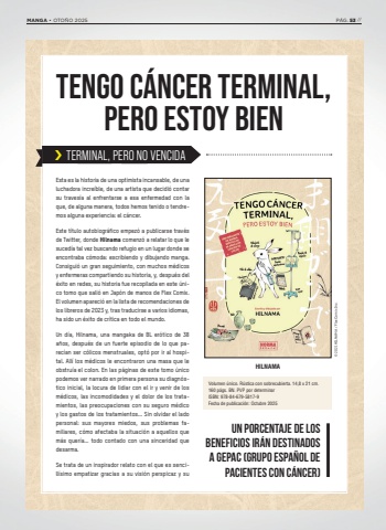 Esta es la historia de una optimista incansable, de una luchadora incre%u00edble, de una artista que decidi%u00f3 contar su traves%u00eda al enfrentarse a esa enfermedad con la que, de alguna manera, todos hemos tenido o tendremos alguna experiencia: el c%u00e1ncer. Este t%u00edtulo autobiogr%u00e1fico empez%u00f3 a publicarse trav%u00e9s de Twitter, donde Hilnama comenz%u00f3 a relatar lo que le suced%u00eda tal vez buscando refugio en un lugar donde se encontraba c%u00f3moda: escribiendo y dibujando manga. Consigui%u00f3 un gran seguimiento, con muchos m%u00e9dicos y enfermeras compartiendo su historia, y, despu%u00e9s del %u00e9xito en redes, su historia fue recopilada en este %u00fanico tomo que sali%u00f3 en Jap%u00f3n de manos de Flex Comix. El volumen apareci%u00f3 en la lista de recomendaciones de los libreros de 2023 y, tras traducirse a varios idiomas, ha sido un %u00e9xito de cr%u00edtica en todo el mundo.Un d%u00eda, Hilnama, una mangaka de BL er%u00f3tico de 38 a%u00f1os, despu%u00e9s de un fuerte episodio de lo que parec%u00edan ser c%u00f3licos menstruales, opt%u00f3 por ir al hospital. All%u00ed los m%u00e9dicos le encontraron una masa que le obstru%u00eda el colon. En las p%u00e1ginas de este tomo %u00fanico podemos ver narrado en primera persona su diagn%u00f3stico inicial, la locura de lidiar con el ir y venir de los m%u00e9dicos, las incomodidades y el dolor de los tratamientos, las preocupaciones con su seguro m%u00e9dico y los gastos de los tratamientos... Sin olvidar el lado personal: sus mayores miedos, sus problemas familiares, c%u00f3mo afectaba la situaci%u00f3n a aquellos que m%u00e1s quer%u00eda... todo contado con una sinceridad que desarma.Se trata de un inspirador relato con el que es sencill%u00edsimo empatizar gracias a su visi%u00f3n perspicaz y su Volumen %u00fanico. R%u00fastica con sobrecubierta. 14,8 x 21 cm. 160 p%u00e1gs. BN. PVP por determinarISBN: 978-84-679-5817-9Fecha de publicaci%u00f3n: Octubre 2025TENGO C%u00c1NCER TERMINAL,PERO ESTOY BIEN%u00a9 2021 HILNAMA / FlexComix Inc.HILNAMA%u203a TERMINAL, PERO NO VENCIDAUN PORCENTAJE DE LOS BENEFICIOS IR%u00c1N DESTINADOS A GEPAC (GRUPO ESPA%u00d1OL DE PACIENTES CON C%u00c1NCER)MANGA %u2022 OTO%u00d1O 2025 P%u00c1G. 53 //