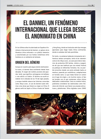 En los %u00faltimos a%u00f1os ha aterrizado en Espa%u00f1a el fen%u00f3meno internacional del danmei, un g%u00e9nero de la literatura china enfocado a un p%u00fablico femenino y caracterizado por sus tramas rom%u00e1nticas entre hombres en un ambiente de fantas%u00eda.ORIGEN DEL G%u00c9NEROAunque en nuestro pa%u00eds sigue siendo relativamente nuevo, el danmei lleva existiendo desde hace d%u00e9cadas. El origen del nombre proviene del japon%u00e9s, tanbi, que significa %u00abentregarse a la belleza%u00bb o %u00abser adicto a lo bello%u00bb. El t%u00e9rmino se acu%u00f1%u00f3 alrededor de la d%u00e9cada de los 70 del siglo pasado, y aunque tambi%u00e9n abarca las historias conocidas como %u00abBoys Love%u00bb, el uso de danmei suele referirse a las obras que tienen su origen en China. El g%u00e9nero salt%u00f3 de Jap%u00f3n a China a trav%u00e9s de Taiw%u00e1n y Hong Kong, donde se traduc%u00edan este tipo mangas japoneses para llegar hasta China continental, donde no estaban del todo permitidos.Por tanto, no estamos hablando %u00fanicamente de literatura: ambos conceptos, tanto el de %u00abdanmei%u00bb como el de %u00abBoys Love%u00bb, se usan para todo el abanico de productos ACG (anime, c%u00f3mics y juegos), de ah%u00ed que sea habitual que una misma historia se publique en diferentes formatos. As%u00ed, es posible encontrar desde una serie animada hasta un manhua, pasando por audiolibros y adaptaciones en formato serie. Lo que todas tienen en com%u00fan es el lugar de origen, y en muchos casos, el tipo de formato con el que comienzan: sitios chinos dedicados a webnovelas. Como su nombre indica, podr%u00edamos considerar las webnovelas como literatura de internet, que tienen sus propias estructuras y plataformas. Sitios digitales como JJWXC EL DANMEI, UN FEN%u00d3MENO INTERNACIONAL QUE LLEGA DESDE EL ANONIMATO EN CHINADANMEI %u2022 OTO%u00d1O 2025 P%u00c1G. 79 //