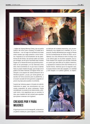 %u2014siglas de Jinjiang Wenxue Cheng, que se podr%u00eda traducir del chino como %u00abJinjiang, la ciudad de la literatura%u00bb%u2014 son el hogar de nacimiento de todas estas novelas que luego pasar%u00edan a otros formatos. Inspirado en el funcionamiento de las plataformas de fan fiction, las autoras suben sus obras por entregas, de ah%u00ed que el resultado sean novelas largas con un desarrollo lento que permite profundizar en los personajes y en las relaciones entre ellos. Este ecosistema en el que nace el danmei tiene su propio modelo de pago, que encaja con el p%u00fablico de estas historias: de alguna forma contribuyen a una especie de %u00abdemocratizaci%u00f3n de la literatura popular%u00bb, ya que, por norma general, se escribe de forma exclusiva para la plataforma, y el usuario accede de forma gratuita o pagando un precio muy bajo para acceder al contenido. Cuando las historias pasan al formato de edici%u00f3n tradicional en papel, nos encontramos con una novela compuesta de varios vol%u00famenes. Podr%u00eda considerarse un producto de coleccionista, enfocado tanto a las seguidoras que ya conoc%u00edan la obra, pero tambi%u00e9n de f%u00e1cil acceso para aquellas que quieran comenzar con el g%u00e9nero. CREADOS POR Y PARA MUJERESAl igual que ocurre con los mangas BL, el danmei es un g%u00e9nero creado por y para mujeres. La intenci%u00f3n es disfrutar de la belleza masculina, con una ambientaci%u00f3n muy alejada de la realidad. En la exposici%u00f3n Fantasy Wonderland que acogi%u00f3 el Museo de Arte Contempor%u00e1neo de Tainan en 2024, se establec%u00eda una clara diferencia entre los Boys Love y los c%u00f3mics gays: en el primer supuesto, las autoras siempre son mujeres que escriben teniendo en cuenta que ser%u00e1 le%u00eddo por el p%u00fablico femenino, y representa el romance entre dos hombres en un mundo ficticio, mientras que en el segundo caso, la propia historia est%u00e1 m%u00e1s apegada a la realidad y est%u00e1 dirigido a un p%u00fablico general, no espec%u00edDANMEI %u2022 OTO%u00d1O 2025 P%u00c1G. 80 //