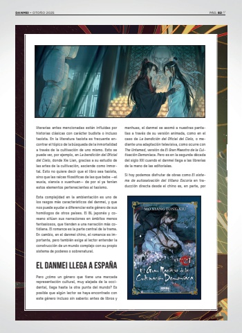 literarias antes mencionadas est%u00e1n influidas por historias cl%u00e1sicas con car%u00e1cter budista o incluso tao%u00edsta. En la literatura tao%u00edsta es frecuente encontrar el t%u00f3pico de la b%u00fasqueda de la inmortalidad a trav%u00e9s de la cultivaci%u00f3n de uno mismo. Esto se puede ver, por ejemplo, en La bendici%u00f3n del Oficial del Cielo, donde Xie Lian, gracias a su estudio de las artes de la cultivaci%u00f3n, asciende como inmortal. Esto no quiere decir que el libro sea tao%u00edsta, sino que las ra%u00edces filos%u00f3ficas de las que bebe %u2014el wuxia, xianxia o xuanhuan%u2014 de por s%u00ed ya ten%u00edan estos elementos pertenecientes al tao%u00edsmo. Esta complejidad en la ambientaci%u00f3n es uno de los rasgos m%u00e1s caracter%u00edsticos del danmei, y que nos puede ayudar a diferenciar este g%u00e9nero de sus hom%u00f3logos de otros pa%u00edses. El BL japon%u00e9s y coreano sit%u00faan sus narraciones en %u00e1mbitos menos fantasiosos, que tienden a una narraci%u00f3n m%u00e1s cotidiana. El romance es la parte central de la trama. En cambio, en el danmei chino, el romance es importante, pero tambi%u00e9n exige al lector entender la construcci%u00f3n de un mundo complejo con su propio sistema de poderes o sobrenatural.EL DANMEI LLEGA A ESPA%u00d1APero %u00bfc%u00f3mo un g%u00e9nero que tiene una marcada representaci%u00f3n cultural, muy alejada de la occidental, llega hasta la otra punta del mundo? Es posible que alg%u00fan lector se haya encontrado con este g%u00e9nero incluso sin saberlo: antes de libros y manhuas, el danmei se asom%u00f3 a nuestras pantallas a trav%u00e9s de su versi%u00f3n animada, como en el caso de La bendici%u00f3n del Oficial del Cielo, o mediante una adaptaci%u00f3n televisiva, como ocurre con The Untamed, versi%u00f3n de El Gran Maestro de la Cultivaci%u00f3n Demon%u00edaca. Pero es en la segunda d%u00e9cada del siglo XXI cuando el danmei llega a las librer%u00edas de la mano de las editoriales. Si hoy podemos disfrutar de obras como El sistema de autosalvaci%u00f3n del Villano Escoria en traducci%u00f3n directa desde el chino es, en parte, por DANMEI %u2022 OTO%u00d1O 2025 P%u00c1G. 82 //