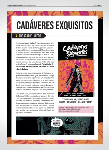 El guionista James Tynion IV viene demostrando desde hace a%u00f1os que no hay nadie como %u00e9l a la hora de destilar la dosis exacta de horror, paranoia y suspense que ha filtrado en c%u00f3mics como El Departamento de la Verdad, W0rldtr33 o El depravado. Este mes, suma un nuevo t%u00edtulo a nuestro cat%u00e1logo. Se trata de Cad%u00e1veres exquisitos, una serie que, como ya da a entender el t%u00edtulo, se ha creado en equipo, en algo parecido a como se crean los episodios de TV. En este caso junto a Tynion IV tenemos a Pornsak Pichetshote, Michael Walsh, Marianna Ignazzi, Valentine De Landro y Jordie Bellaire.Tynion IV centra el punto de partida de Cad%u00e1veres exquisitos en una sola idea: %u201c%u00bfY si tom%u00e1ramos la energ%u00eda de un gran evento de superh%u00e9roes y la traslad%u00e1ramos a algo que me interesa m%u00e1s como es el terror de alto voltaje con personajes grandes y coloridos? Ah%u00ed fue donde todo comenz%u00f3 realmente para m%u00ed. Los personajes parecen sacados de la vida real. Son personas normales y corrientes arrojadas a una puta pesadilla%u201d. Cada cinco a%u00f1os, las doce familias m%u00e1s poderosas de Estados Unidos se disputan el gobierno del pa%u00eds. Cada partida se celebra en un lugar distinto. El tablero suele ser una localidad peque%u00f1a y aislada hasta donde se desplaza un pu%u00f1ado de asesinos. Cada uno de ellos representa a una familia, y su misi%u00f3n consiste en matarse entre s%u00ed. Solo puede quedar uno. La familia cuyo asesino haya sobrevivido gobernar%u00e1 el pa%u00eds los siguientes cinco a%u00f1os. CAD%u00c1VERES EXQUISITOS%u203a ABRAZAR EL MIEDOVolumen 1 de 3. R%u00fastica. 17 x 26 cm. 144 p%u00e1gs. Color. PVP: 22,00 %u20ac. ISBN: 978-84-679-8055-4Fecha de publicaci%u00f3n: Enero de 2026TYNION / WALSH / PICHETSHOTEIGNAZZI / DE LANDRO / BELLAIRE / CAREYEXQUISITE CORPSES is %u2122 and %u00a9 2026 James Tynion IV & Michael Walsh. All rights reserved.C%u00d3MIC AMERICANO %u2022 INVIERNO 2026 P%u00c1G. 103 //