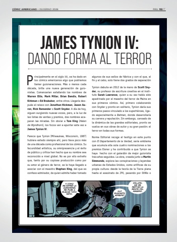 Principalmente en el siglo xxi, se ha dado en los c%u00f3mics americanos algo que podr%u00edamos llamar guioneraciones. M%u00e1s o menos cada d%u00e9cada, brilla una nueva generaci%u00f3n de guionistas. Comenzar%u00edan estallando los nombres de Warren Ellis, Mark Millar, Brian Bendis, Robert Kirkman o Ed Brubaker, entre otros. Llegar%u00eda despu%u00e9s el relevo con Jonathan Hickman, Jason Aaron, Rick Remender o Scott Snyder. A d%u00eda de hoy, siguen surgiendo nuevas voces, pero, a la luz de las listas de ventas y premios, dos nombres acaparan las miradas. Sin obviar a Tom King (Helen de Wyndhorn), los focos van a apuntar esta vez a James Tynion IV.Parece que Tynion (Milwaukee, Wisconsin, 1987) hubiera estado siempre ah%u00ed, pero lleva poco m%u00e1s de una d%u00e9cada como profesional de los c%u00f3mics. Su fecundidad art%u00edstica, su omnipresencia y el %u00e9xito de p%u00fablico y cr%u00edtica han hecho que su nombre sea reconocido a nivel global. No es por ello extra%u00f1o que, tanto por su copiosa producci%u00f3n como por su amor al g%u00e9nero de terror, se le haya llegado a asociar con el maestro Stephen King, del que es confeso admirador, de quien admite haber tomado algunos de sus sellos de f%u00e1brica y con el que, al fin y al cabo, solo tiene dos grados de separaci%u00f3nTynion debuta en 2012 de la mano de Scott Snyder, su profesor de escritura creativa en el instituto Sarah Lawrence, quien a su vez hab%u00eda sido apadrinado por el maestro del terror de Maine en sus primeros c%u00f3mics. As%u00ed, primero colaborando con Snyder y pronto en solitario, Tynion dar%u00eda sus primeros pasos vinculado a los superh%u00e9roes, ligado especialmente a Batman, donde desarrollar%u00eda su carrera y reputaci%u00f3n. Sin embargo, cansado de la din%u00e1mica de las grandes editoriales, pronto se vuelca en sus obras de autor y su gran pasi%u00f3n: el terror en todas sus formas.Norma Editorial recoge el testigo en este punto con El Departamento de la Verdad, serie emblema que acumula ella sola cuatro nominaciones a los premios Eisner y ha contribuido a que Tynion se haya hecho con el galard%u00f3n de mejor guionista tres a%u00f1os seguidos. La obra, creada junto a Martin Simmonds, explora las conspiraciones y leyendas urbanas de Estados Unidos, como art%u00edfices de su propia cultura: desde la teor%u00eda de la Tierra plana hasta el asesinato de JFK, pasando por OVNIs o JAMES TYNION IV:DANDO FORMA AL TERRORC%u00d3MIC AMERICANO %u2022 INVIERNO 2026 P%u00c1G. 113 //