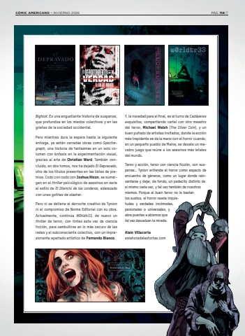 Bigfoot. Es una angustiante historia de suspense, que profundiza en los miedos colectivos y en las grietas de la sociedad occidental.Pero mientras dura la espera hasta la siguiente entrega, ya est%u00e1n cerradas obras como Spectregraph, una historia de fantasmas en un solo volumen con %u00e9nfasis en la experimentaci%u00f3n visual, gracias al arte de Christian Ward. Tambi%u00e9n concluido, en dos tomos, nos ha dejado El Depravado, otro de los t%u00edtulos presentes en las listas de premios. Codo con codo con Joshua Hixon, se sumergen en el thriller psicol%u00f3gico de asesinos en serie al estilo de El Silencio de los corderos, aderezado con unas gotitas de slasher.Pero ni se detiene el derroche creativo de Tynion ni el compromiso de Norma Editorial con su obra. Actualmente, contin%u00faa W0rldtr33, de nuevo un thriller de terror, con tintes esta vez de ciencia ficci%u00f3n, para zambullirse en lo m%u00e1s oscuro de las redes y el subconsciente colectivo, con un impresionante apartado art%u00edstico de Fernando Blanco.Y, la novedad para el final, es el turno de Cad%u00e1veres exquisitos, compartiendo cartel con otro maestro del terror, Michael Walsh (The Silver Coin), y un buen pu%u00f1ado de artistas invitados, donde la acci%u00f3n m%u00e1s trepidante se da la mano con el horror cuando, en un peque%u00f1o pueblo de Maine, se desate un macabro juego que re%u00fane a los asesinos m%u00e1s letales del mundo.Terror y acci%u00f3n, terror con ciencia ficci%u00f3n, con suspense%u2026 Tynion entiende el horror como espacio de encuentro de g%u00e9neros, como un lugar donde reinventarse y dejar, de fondo, un pedacito distinto de s%u00ed mismo cada vez, y tal vez tambi%u00e9n de nosotros mismos. Porque al buen terror no le bastan los sustos, el horror revela inquietudes y verdades inc%u00f3modas, personales o universales, y abre puertas a abismos que tal vez devuelvan la mirada.Alain Villacortaeslahoradelastortas.comC%u00d3MIC AMERICANO %u2022 INVIERNO 2026 P%u00c1G. 114 //