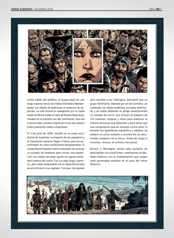 reci%u00e9n salido del astillero, el buque zarp%u00f3 en una larga traves%u00eda hacia las Indias Orientales Neerlandesas con objeto de dedicarse al comercio de especias. La ruta inclu%u00eda la navegaci%u00f3n por la costa oeste de %u00c1frica hasta el cabo de Buena Esperanza, situado en el extremo sur del continente. Una vez cruz%u00f3 el cabo, el barco sigui%u00f3 por el sur del oc%u00e9ano %u00cdndico poniendo rumbo a Indonesia. El 4 de junio de 1629, encall%u00f3 en la costa occidental de Australia. La mayor%u00eda de los pasajeros y la tripulaci%u00f3n lograron llegar a tierra, pero se encontraban en unas condiciones desesperadas. El comandante Pelsaert tom%u00f3 la decisi%u00f3n de reclutar un pu%u00f1ado de hombres para iniciar una expedici%u00f3n con objeto de pedir ayuda en alguna localidad costera del norte. Fue un viaje largo y penoso, pero nada comparable con el espect%u00e1culo que se encontraron a su regreso. Y es que, de regreso para rescatar a los n%u00e1ufragos, descubri%u00f3 que un grupo dominante, liderado por un tal Cornelisz, un iluminado con ideas her%u00e9ticas, se hab%u00eda amotinado y se hab%u00eda dedicado al pillaje estableciendo un reinado de horror que incluy%u00f3 la masacre de 110 hombres, mujeres y ni%u00f1os para disminuir el n%u00famero de bocas que alimentar y para evitar que una conspiraci%u00f3n que se volviese contra ellos. El rescate fue igualmente expeditivo y b%u00e1rbaro: se celebr%u00f3 un juicio sumario y muchos de los amotinados acabaron en la horca. Antes de colgar a Cornelisz, incluso, le cortaron las manos. Dorison y Montaigne narran esta sucesi%u00f3n de atrocidades con pulso firme, combinando la fidelidad hist%u00f3rica con la dramatizaci%u00f3n que exigen unos personajes sumidos en el pozo del horror absoluto.C%u00d3MIC EUROPEO %u2022 INVIERNO 2026 P%u00c1G. 136 //