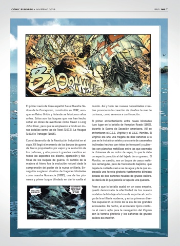 El primer nav%u00edo de l%u00ednea espa%u00f1ol fue el Nuestra Se%u00f1ora de la Concepci%u00f3n, construido en 1692, aunque en Reino Unido y Holanda se fabricaron a%u00f1os antes. Estos son los buques que nos han hecho so%u00f1ar en obras de aventuras como Raven o Long John Silver, pero que se emplearon a fondo en duras batallas como las de Texel (1673), La Hougue (1692) o Trafalgar (1805).Con el desarrollo de la Revoluci%u00f3n Industrial en el siglo XIX lleg%u00f3 el momento de los barcos de guerra de hierro propulsados por vapor y la evoluci%u00f3n de los ca%u00f1ones, y ello provoc%u00f3 grandes cambios en todos los aspectos del dise%u00f1o, operaci%u00f3n y t%u00e1cticas de los buques de guerra. El cambio de la madera al hierro fue la evoluci%u00f3n natural dada la comprensi%u00f3n del poder de la nueva artiller%u00eda. Enseguida surgieron dise%u00f1os de fragatas blindadas como nuestra Numancia (1862), una de las pioneras y primer buque blindado en dar la vuelta al mundo. As%u00ed y todo las nuevas necesidades creadas provocaron la creaci%u00f3n de dise%u00f1os la mar de curiosos, como veremos a continuaci%u00f3n.El primer enfrentamiento entre naves blindadas tuvo lugar en la batalla de Hampton Roads (1862), durante la Guerra de Secesi%u00f3n americana. All%u00ed se enfrentaron el C.S.S. Virginia y el U.S.S. Monitor. El Virginia era una una fragata de diez ca%u00f1ones a la que se le instal%u00f3 un ariete y una serie de casamatas inclinadas hechas con rieles de ferrocarril y cubiertas con planchas met%u00e1licas entre las que asomaba la chimenea de su motor de vapor, lo que le daba un aspecto parecido al del tejado de un granero. El Monitor, en cambio, era un buque de casco met%u00e1lico rectangular, pero de francobordo baj%u00edsimo, que dejaba la cubierta casi a ras de agua y de la que sobresal%u00eda una torreta giratoria fuertemente blindada dotada de dos ca%u00f1ones navales de grueso calibre. Se dec%u00eda de %u00e9l que parec%u00eda la tapa de una quesera.Pese a que la batalla acab%u00f3 en un soso empate, qued%u00f3 demostrada la efectividad de los nuevos modelos de blindaje a la hora de soportar el castigo de la artiller%u00eda moderna, y estos primeros dise%u00f1os supusieron el inicio de la era de los grandes acorazados. De hecho, el acorazado t%u00edpico combina el casco apto para la navegaci%u00f3n del Virginiacon la torreta giratoria y los ca%u00f1ones de grueso calibre del Monitor.C%u00d3MIC EUROPEO %u2022 INVIERNO 2026 P%u00c1G. 146 //