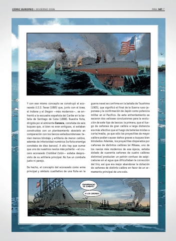 Y con ese mismo concepto se construy%u00f3 el acorazado U.S.S. Texas (1895) que, junto con el Iowa, el Indiana y el Oregon %u2014m%u00e1s modernos%u2014, se enfrent%u00f3 a la escuadra espa%u00f1ola del Caribe en la batalla de Santiago de Cuba (1898). Nuestra flota, dirigida por el almirante Cervera, constaba de seis buques que, si bien no eran antiguos, s%u00ed estaban construidos con un planteamiento obsoleto en comparaci%u00f3n con los barcos estadounidenses: ten%u00edan menos blindaje y artiller%u00eda de menor calibre, adem%u00e1s de inferioridad num%u00e9rica (la flota enemiga constaba de diez barcos). A ello hay que sumar que uno de nuestros nav%u00edos m%u00e1s potente %u2014el crucero acorazado Crist%u00f3bal Col%u00f3n%u2014 estaba desprovisto de su artiller%u00eda principal. No fue un combate justo ni parejo.De hecho, el concepto del acorazado como arma principal y s%u00edmbolo cualitativo de una flota en la guerra naval se confirma en la batalla de Tsushima (1905), que signific%u00f3 el final de la Guerra ruso-japonesa y la confirmaci%u00f3n de Jap%u00f3n como potencia militar en el Pac%u00edfico. De este enfrentamiento se sacaron dos valiosas conclusiones para la evoluci%u00f3n de este tipo de barcos: la primera, que el fuego de ca%u00f1ones de gran calibre a larga distancia era m%u00e1s efectivo que el fuego de bater%u00edas mixtas a corta/media, ya que s%u00f3lo los proyectiles de mayor calibre pod%u00edan causar da%u00f1os graves a buques bien blindados: Adem%u00e1s, los proyectiles disparados por ca%u00f1ones de distintos calibres (el Mikasa, uno de los nav%u00edos m%u00e1s modernos de esa %u00e9poca, estaba dotado de cuarenta ca%u00f1ones de cuatro calibres distintos) produc%u00edan un patr%u00f3n confuso de salpicaduras en el agua que dificultaban la correcci%u00f3n del tiro; as%u00ed que era mejor abandonar la dotaci%u00f3n de ca%u00f1ones de distinto calibre en favor de un armamento principal de uno solo.C%u00d3MIC EUROPEO %u2022 INVIERNO 2026 P%u00c1G. 147 //