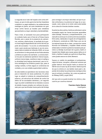 La segunda era el valor del torpedo como arma antibuque, ya que en esta guerra las lanchas torpederas cumplieron su papel asaltando a las embarcaciones enemigas en puerto, as%u00ed como lanz%u00e1ndose con gran arrojo contra barcos ya tocados para rematarlos aprovechando su mayor velocidad y maniobrabilidad.Pese a todo, el acorazado tuvo poca participaci%u00f3n en combate hasta casi el final de la Primera Guerra Mundial, pero a pesar de la presencia de submarinos, aviones y destructores, el resultado de la guerra naval segu%u00eda dependiendo del control del mar por parte del acorazado. Y no se dio un enfrentamiento naval a gran escala que implicase el uso de acorazados hasta la batalla de Jutlandia (1916), en la que se enfrentaron lo m%u00e1s granado de las flotas alemana y brit%u00e1nica en pleno mar del Norte. La victoria t%u00e1ctica fue para los alemanes (perdieron menos buques, sufrieron menos bajas, resistieron mejor el castigo y la oficialidad tom%u00f3 mejores decisiones), pero la victoria estrat%u00e9gica fue brit%u00e1nica puesto que, pese al castigo recibido, la flota segu%u00eda en condiciones de combate y con una notable superioridad num%u00e9rica.De esta batalla se aprendieron dos lecciones clave para el desarrollo de naves posteriores. En primer lugar se adopt%u00f3 el sistema de compartimentaci%u00f3n estanca y de estructura del sistema de control de da%u00f1os de los acorazados alemanes; y en segundo lugar se prob%u00f3 la debilidad de los llamados cruceros de batalla: buques armados con ca%u00f1ones de acorazado pero que sacrificaban buena parte del blindaje para conseguir una mayor velocidad, as%u00ed que no pod%u00edan enfrentarse a la potencia de fuego de un acorazado, como vemos en el c%u00f3mic sobre esta batalla de la colecci%u00f3n Grandes batallas navales.Durante los a%u00f1os veinte y treinta se reformaron varios acorazados seg%u00fan las nuevas lecciones aprendidas sobre blindaje, refuerzos y compartimentaci%u00f3n, y se reanud%u00f3 la carrera por la construcci%u00f3n de acorazados. Entre estos, destacaba el orgullo de la Kriegsmarine: el Bismarck, construido en 1939. Pese a ser uno de los mejores buques de su clase, y aunque las nuevas t%u00e9cnicas de bombardeo y torpedeo desde aviones embarcados no ten%u00edan la potencia necesaria para penetrar su blindaje al principio de la guerra, bast%u00f3 un torpedo bien dirigido para causar graves da%u00f1os en el tim%u00f3n y facilitar el asedio por parte de la Royal Navy, como puede verse en el c%u00f3mic Bismarck.Supuso un cambio de paradigma: el portaaviones, capaz de lanzar, recuperar y almacenar aviones que pod%u00edan destruir otros buques hasta un alcance de 500 Km era el nuevo rey de los mares. Hasta el punto de que la victoria en una batalla naval pas%u00f3 a depender de localizar los portaaviones enemigos antes que el contrario y hundirlos, tal y como se puede ver en Midway (1942) y Leyte (1944).%u00a1As%u00ed que solo os queda localizar los c%u00f3mics y descubrirlo por vosotros mismos! Francisco Javier IllescasInvestigador C%u00d3MIC EUROPEO %u2022 INVIERNO 2026 P%u00c1G. 148 //